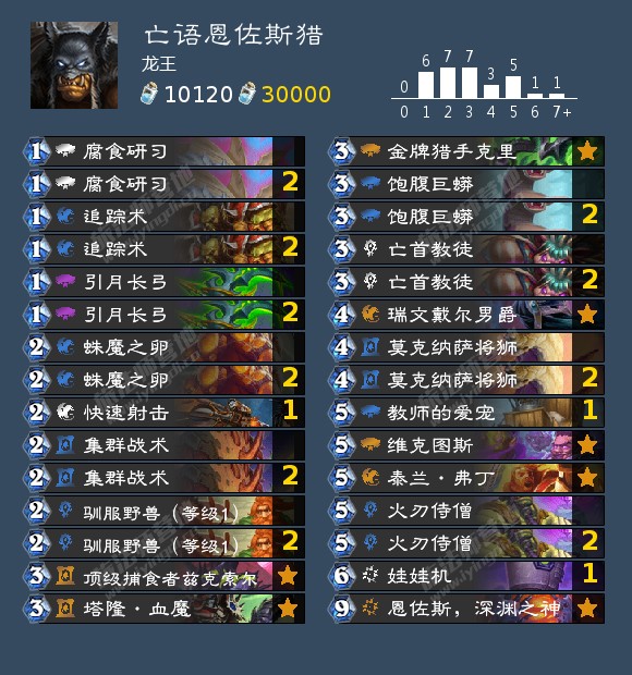 一套加上了恩佐斯体系的亡语猎。首先需要知道的是这套牌恩佐斯可以复活的生物,有饱腹巨蟒终极随从这些亡语野兽还有火刃侍僧亡语里的嘲讽恶魔和机械属性的娃娃机,这一波基本上兼顾了嘲讽护脸,突袭解场和亡语野兽站场,是一波质量很高的场面。为了过渡前期,卡组的前期很依赖引月长弓,快速射击这些牌,需要注意的是可以用引月长弓配合蛛魔之卵开蛋。中期的爆发点是靠血魔和将狮来扩大场面,瑞文的身材裸出对手也不好处理,也可以在自己已经准备送掉亡语的时候上瑞文打出更高的资源价值。其他单卡也是老生常谈的,用集群战术让对手不好处理0-2的蛛魔之卵或者嘲讽亡语野兽,泰兰佛丁是恩佐斯卡组都会考虑带的卡,定向检索。