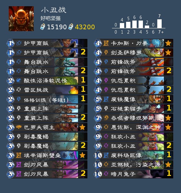 据好吧坚强说,这套牌的思路还是防战,但如果操作得当,打防战牧师稳赢,其他对局也有一战之力,就是保镖德这个对局打不过。防战的整体思路不用多说,这套牌的制胜点是靠恩佐斯和狂欢小丑的铺场获胜,作者给大家分享了一些卡于卡之间的小combo供大家参考: