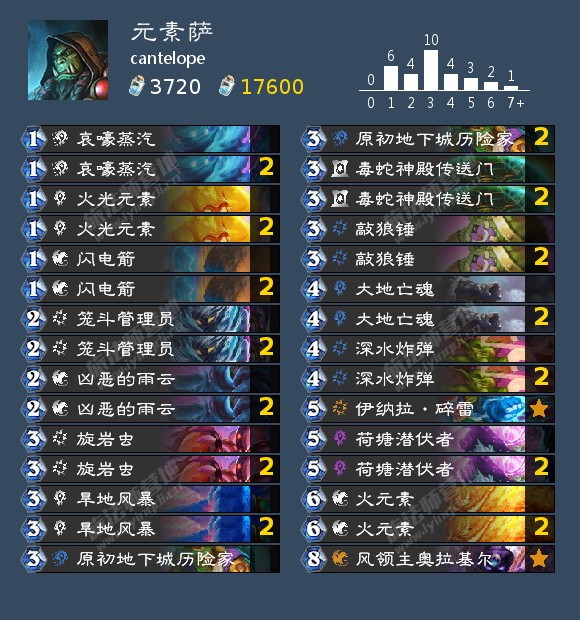和打脸萨不同,这套牌几乎带满了元素生物,是一套中速拍怪卡组,靠元素之间的体系联动压住场面然后踢脸获胜。整套卡组我觉得值得说的点不太多,萨满这个版本玩来玩去一共也就这些牌可以带。