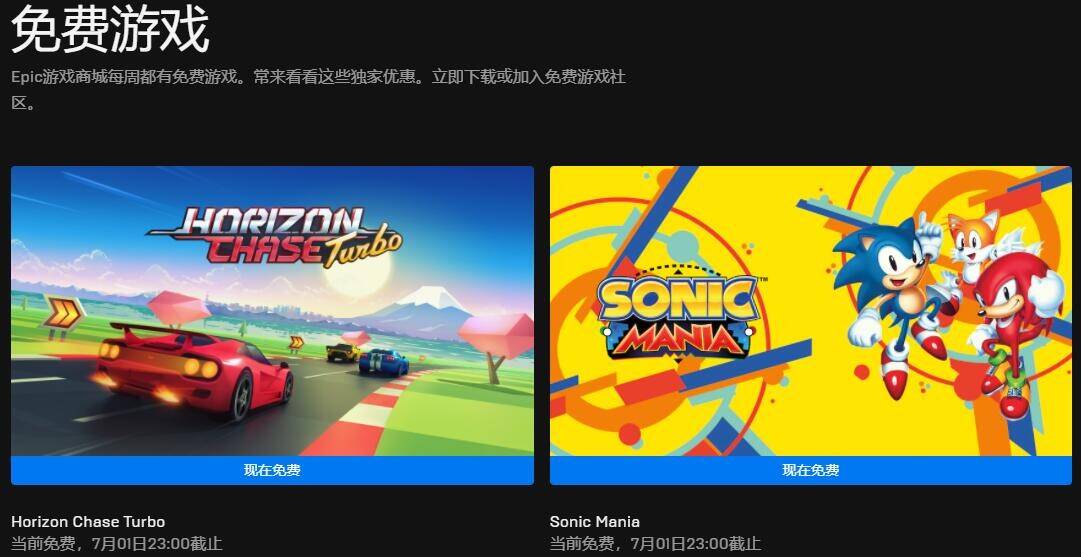 Epic游戏商城本周免费游戏领取现已更新,为《追踪地平线Turbo》(Horizon Chase Turbo)、《索尼克:狂欢》(Sonic Mania),免费领取时间为北京时间6月24日23点至7月1日23点。