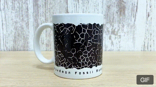 最值得一提的是这个“热感马克杯”,表面一开始是待挖掘的泥土图案,在注入热水之后就像是还原了发掘过程一样,慢慢显露出化石宝可梦的骨骼图案。