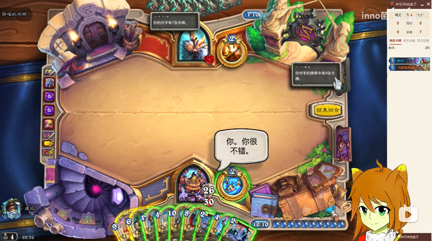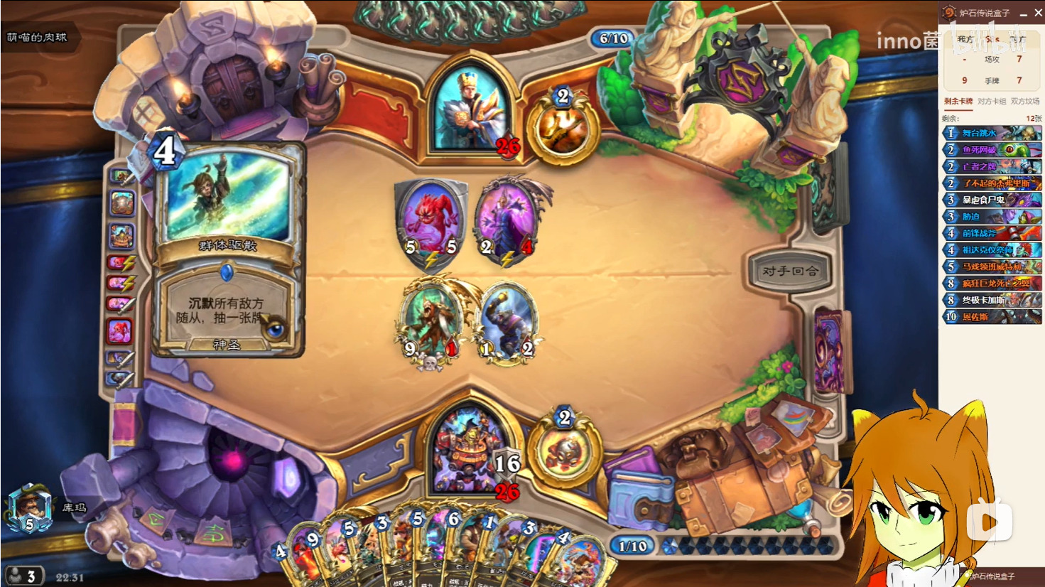 (4)5费回合,由于对手之前交过硬币,且没有打过解读手相减费,故在本回合内是无法使用暗影精华铺场的,所以5费回合我们下威特利过牌,6费下塞布压场限制暗影精华及其他法术;