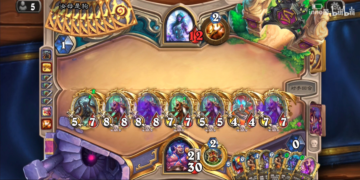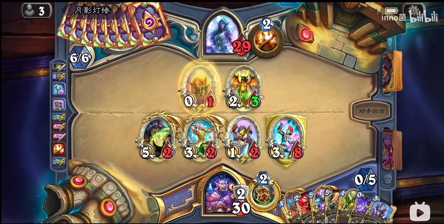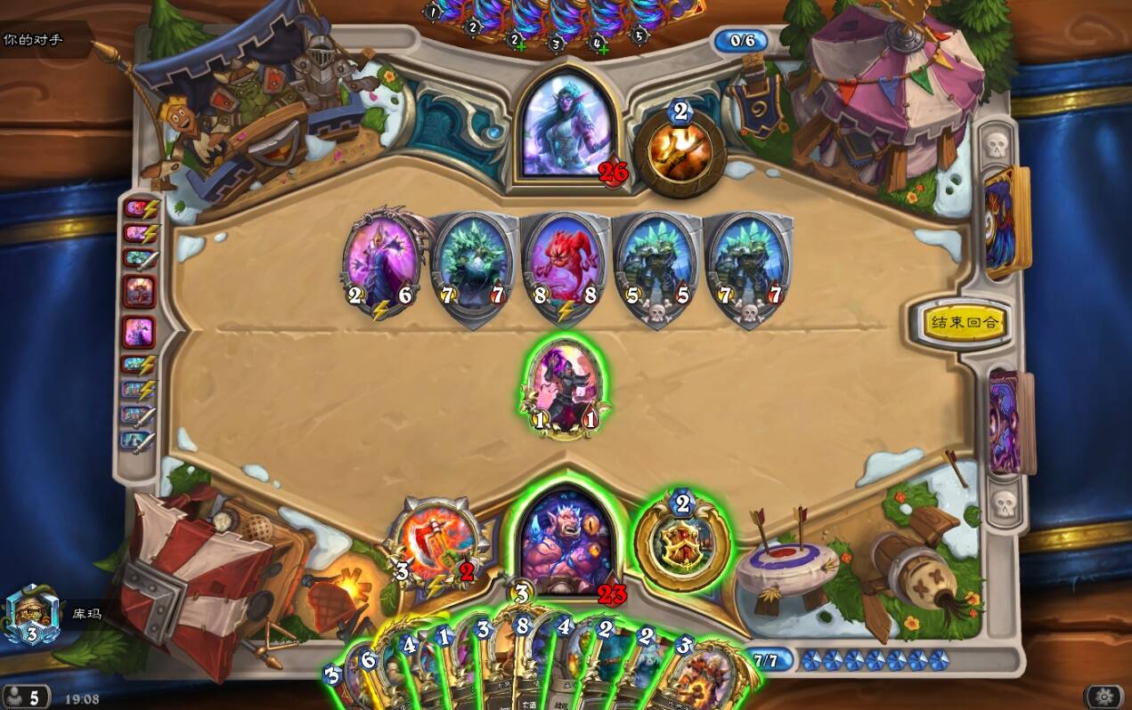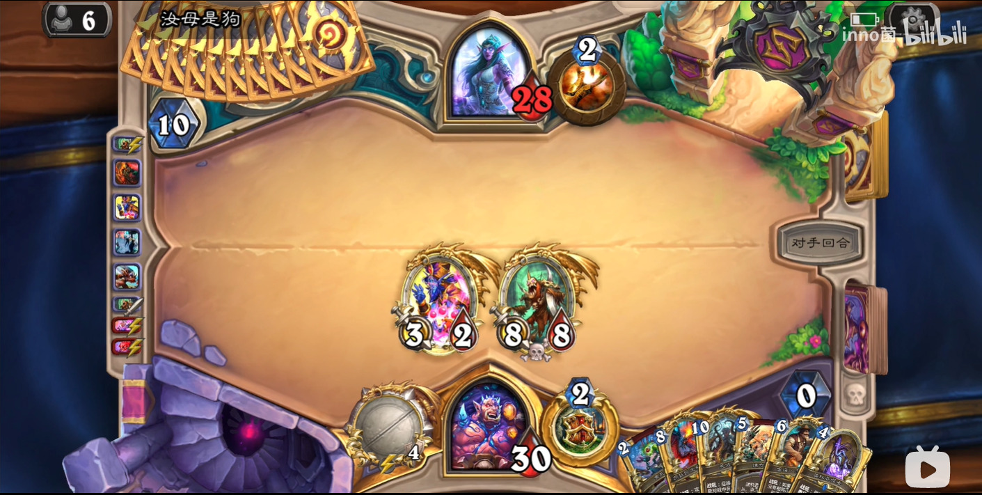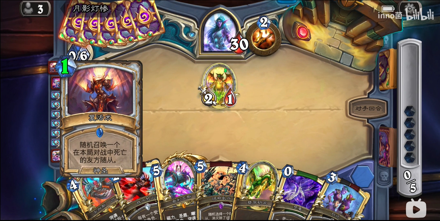 原本估计的是对手可能会强开暗影精华对铺,或者简单地解个场,只要我方能剩个一到两个随从,下回合就能用战斗怒火进行大量过牌进行续航。然而没想到对手花了5费把场面解干净了,剩余1费还打出了一张复活术。