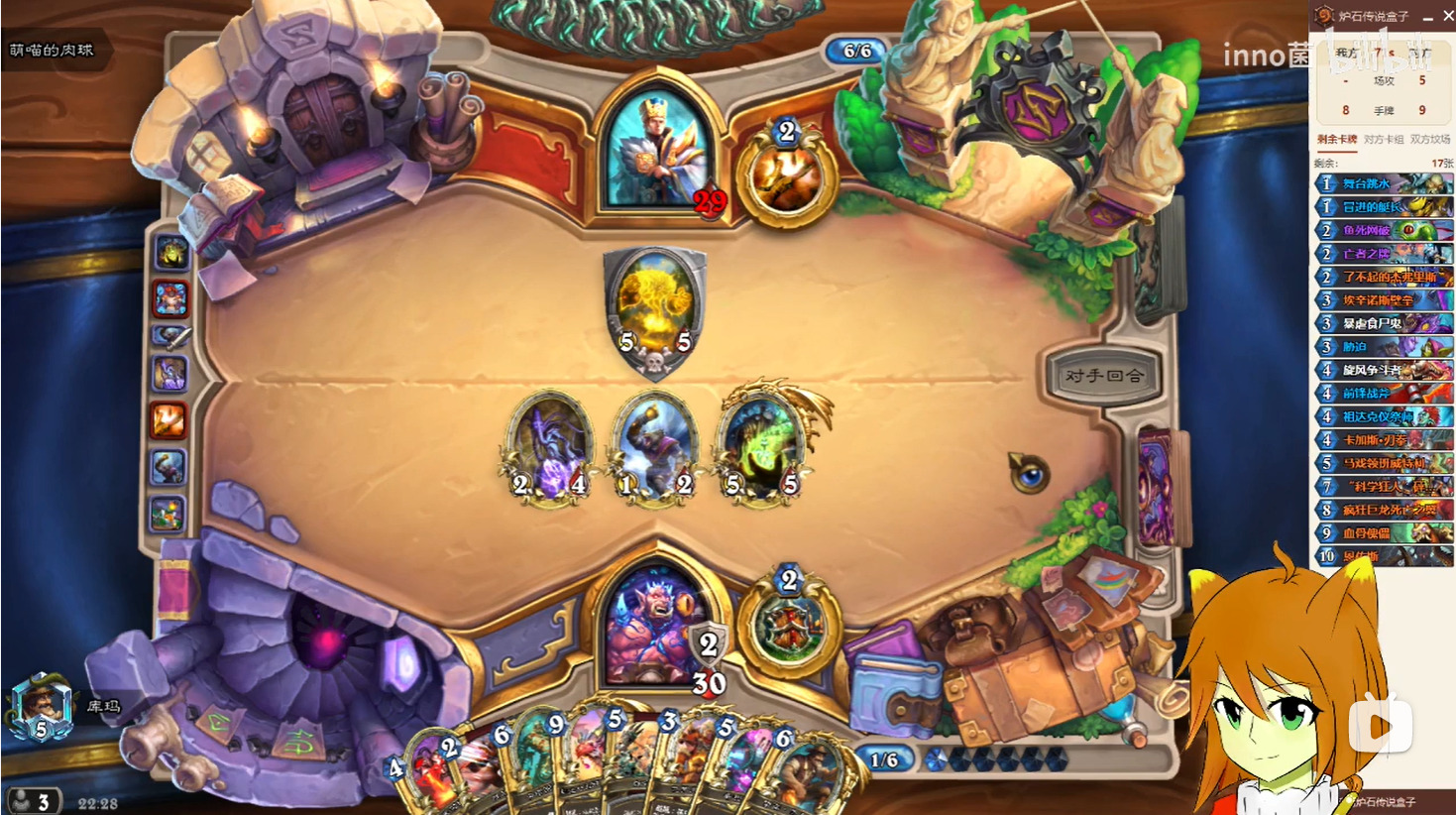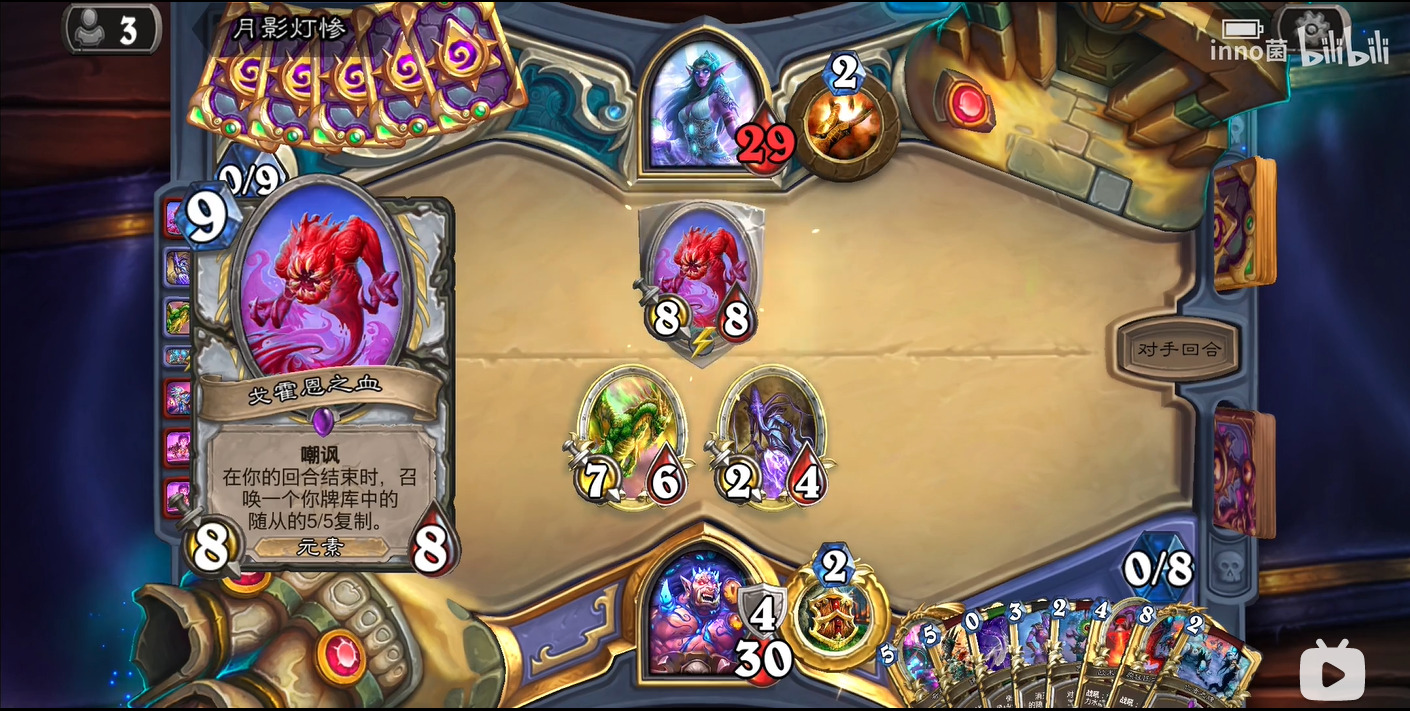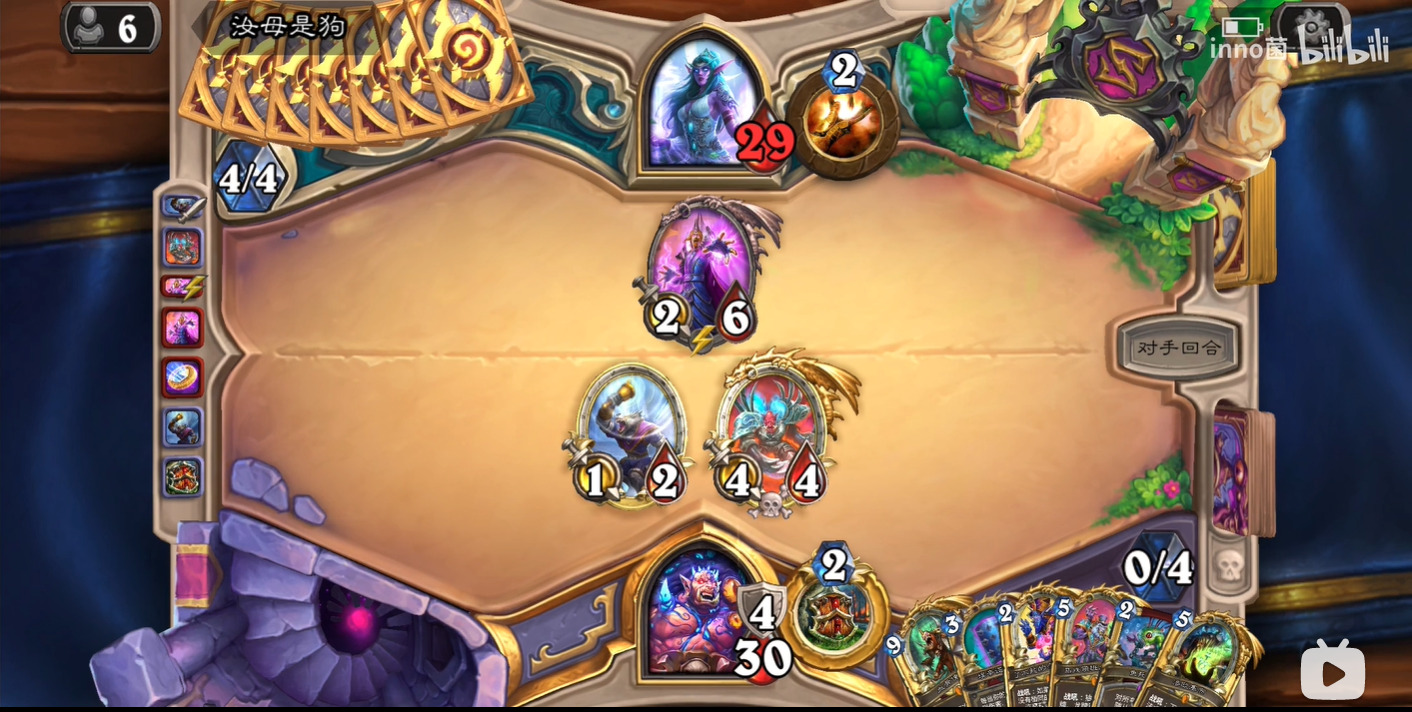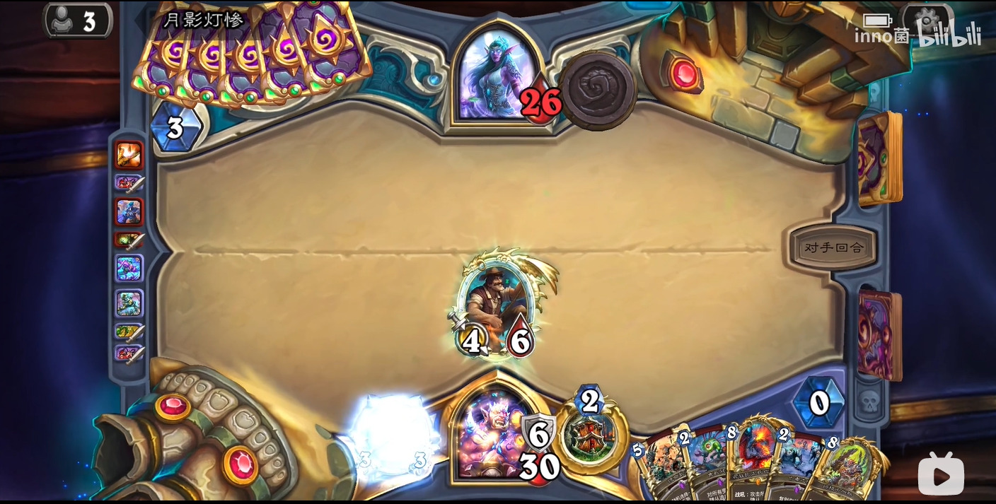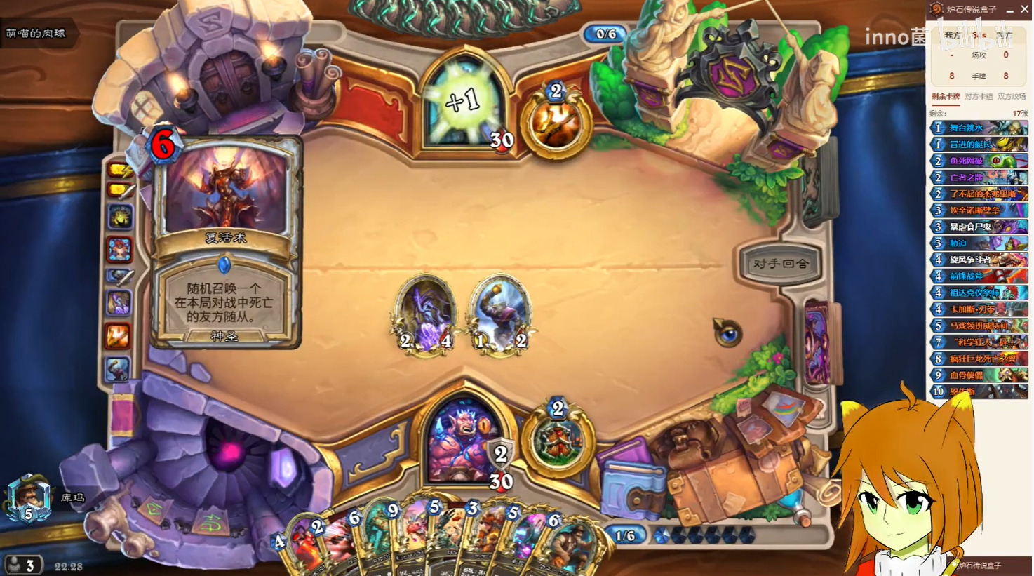 原本估计的是对手可能会强开暗影精华对铺,或者简单地解个场,只要我方能剩个一到两个随从,下回合就能用战斗怒火进行大量过牌进行续航。然而没想到对手花了5费把场面解干净了,剩余1费还打出了一张复活术。