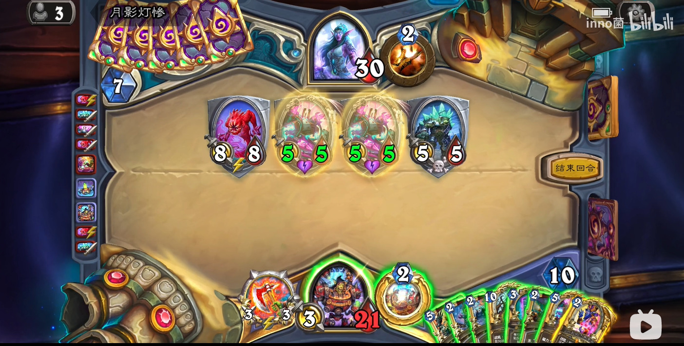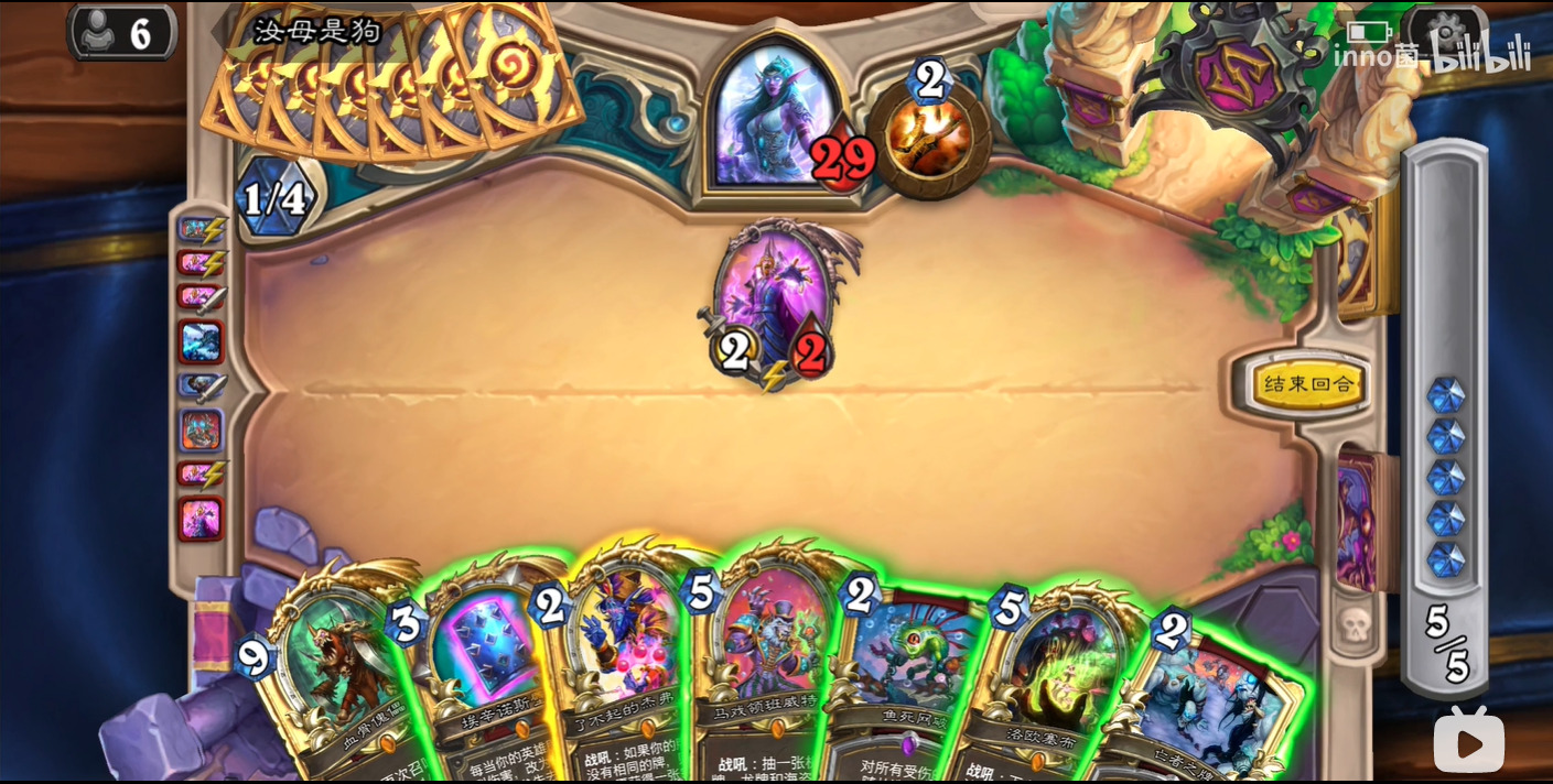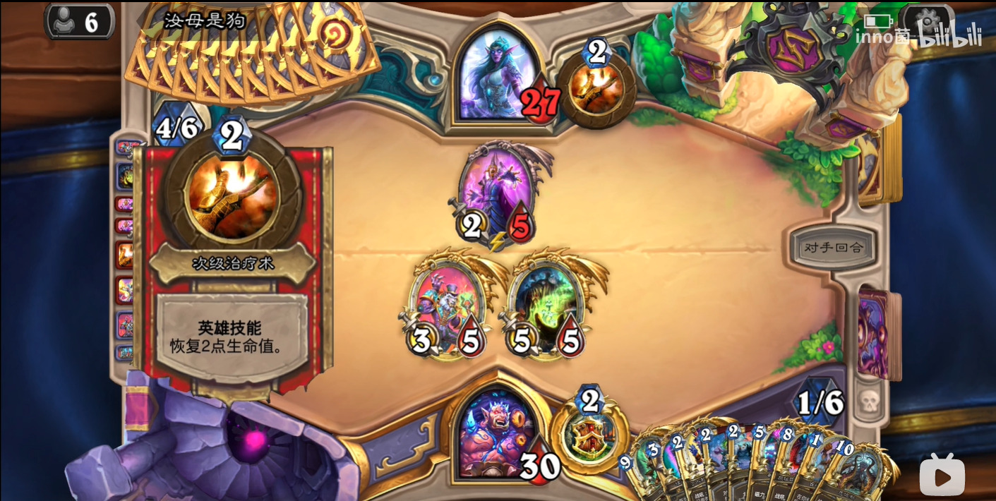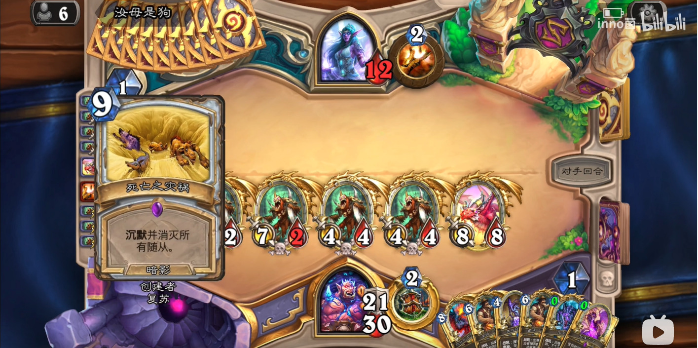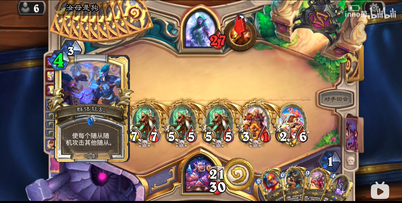 原本估计的是对手可能会强开暗影精华对铺,或者简单地解个场,只要我方能剩个一到两个随从,下回合就能用战斗怒火进行大量过牌进行续航。然而没想到对手花了5费把场面解干净了,剩余1费还打出了一张复活术。