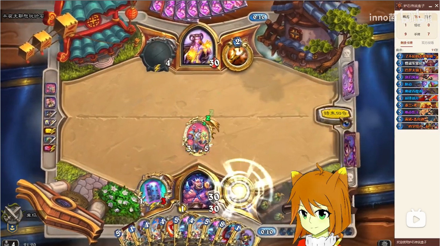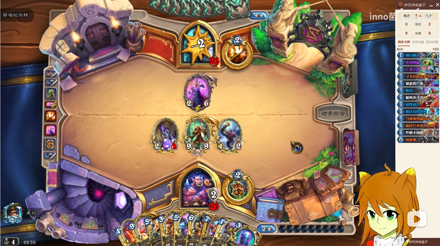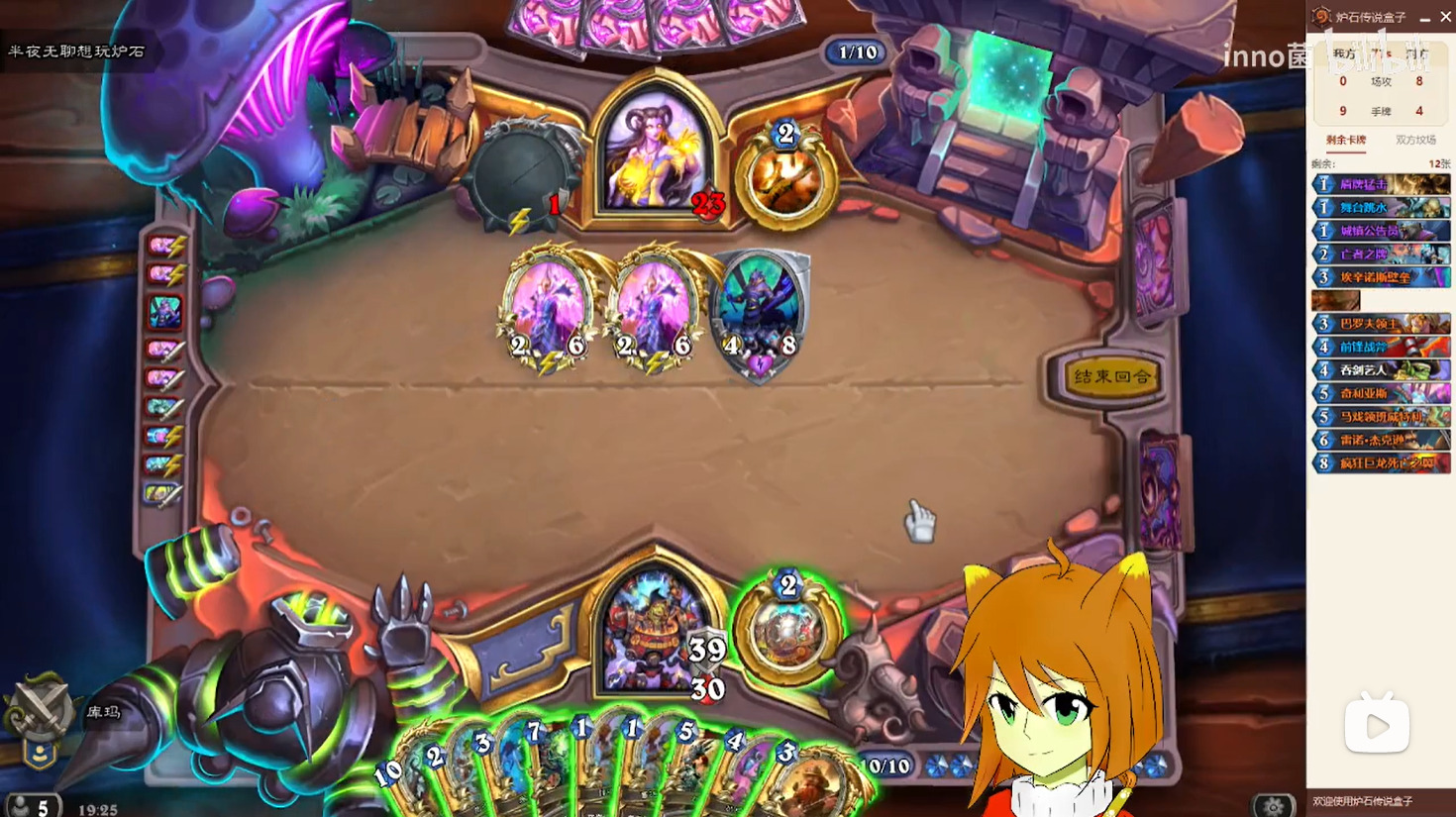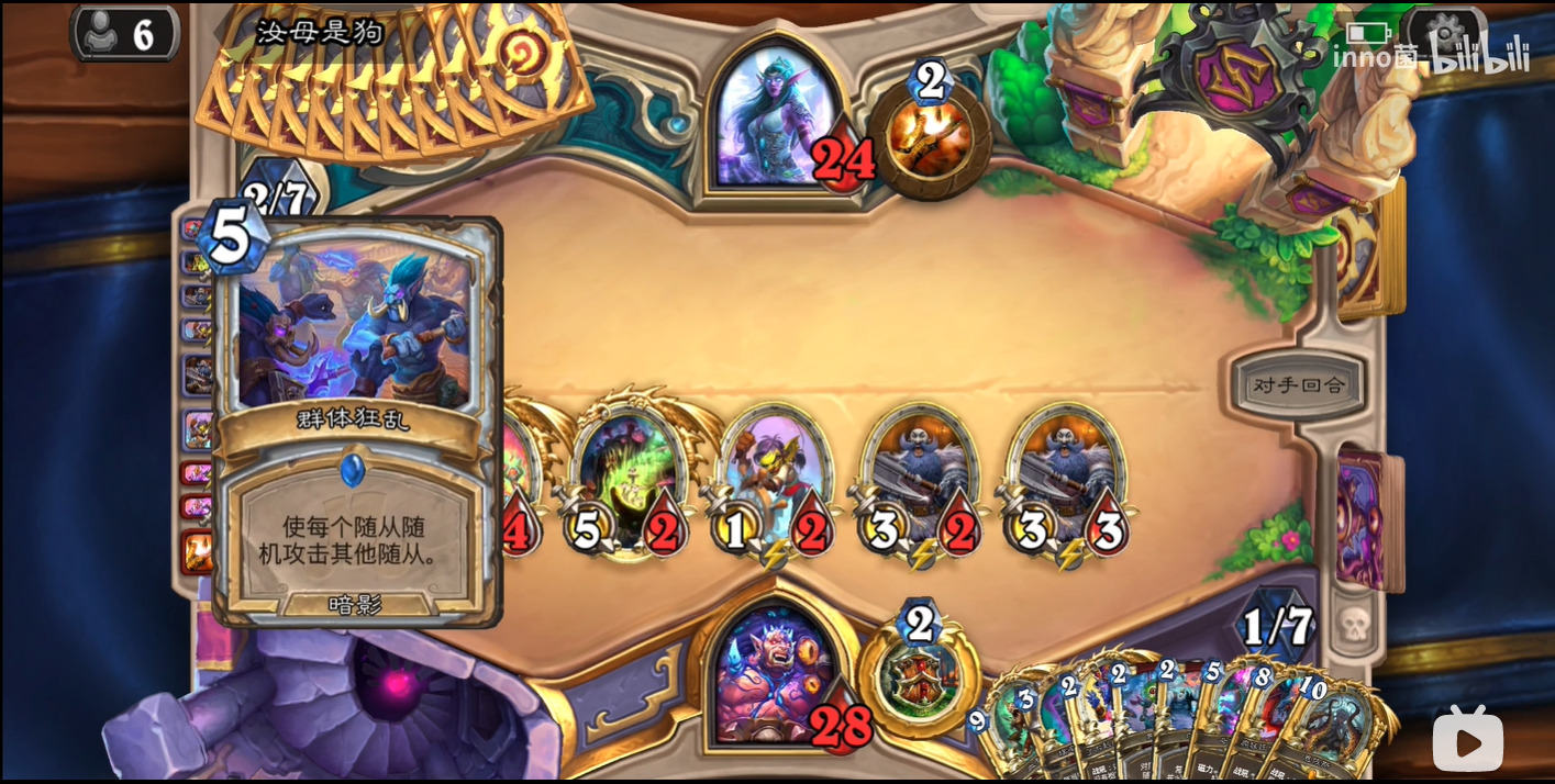 在这样的场面下对手选择了优先清场,打出了群体狂乱来解场,与此同时对手只剩下2费,最多只能用复活术了,不过对手似乎并没有抽到,仅仅是奶了一口脸就回合结束了;如果对手此时使用手里更高费用的解牌(不管是带的,还是发现的),对手甚至连复活术的2费都挤不出来,就结果而言,再一次延缓了对手铺怪的节奏,又成功拖了一个回合;