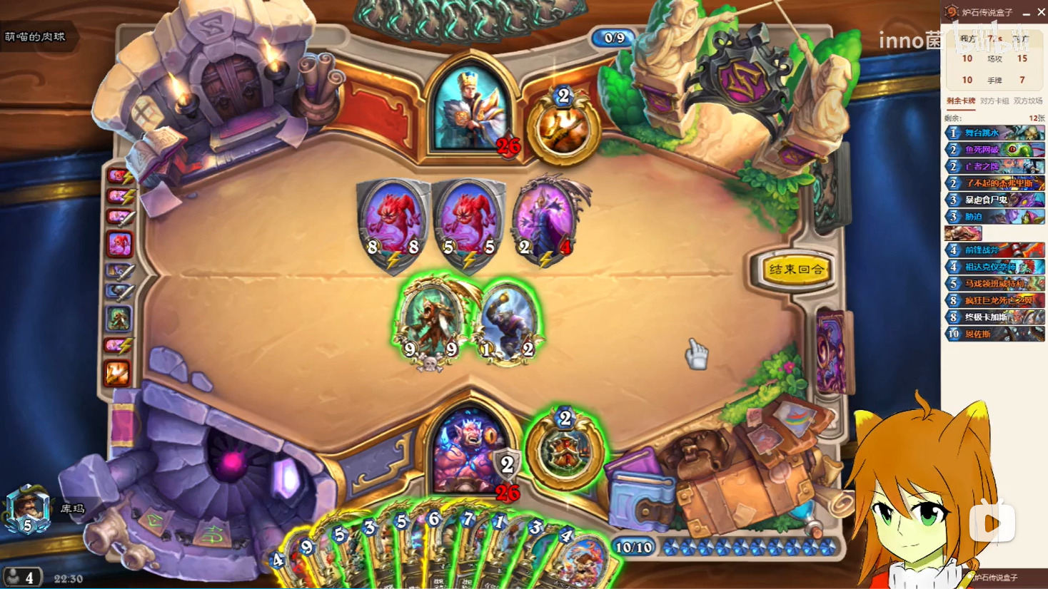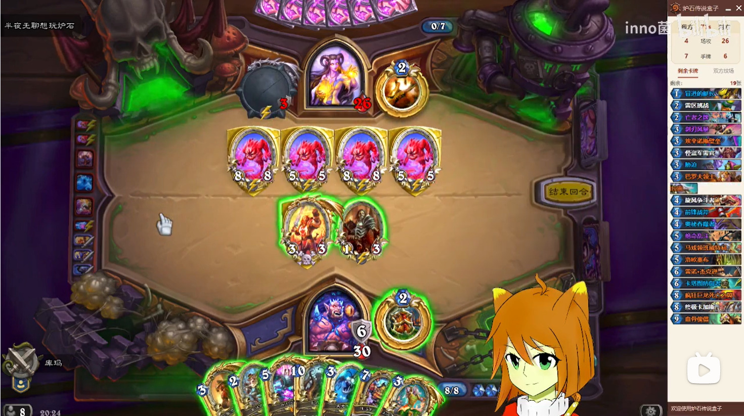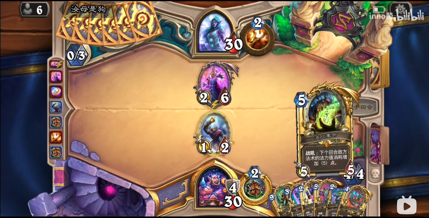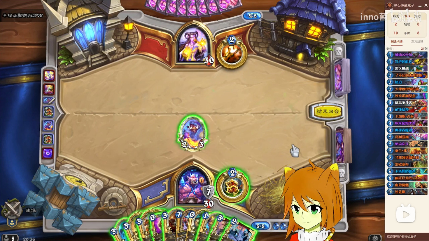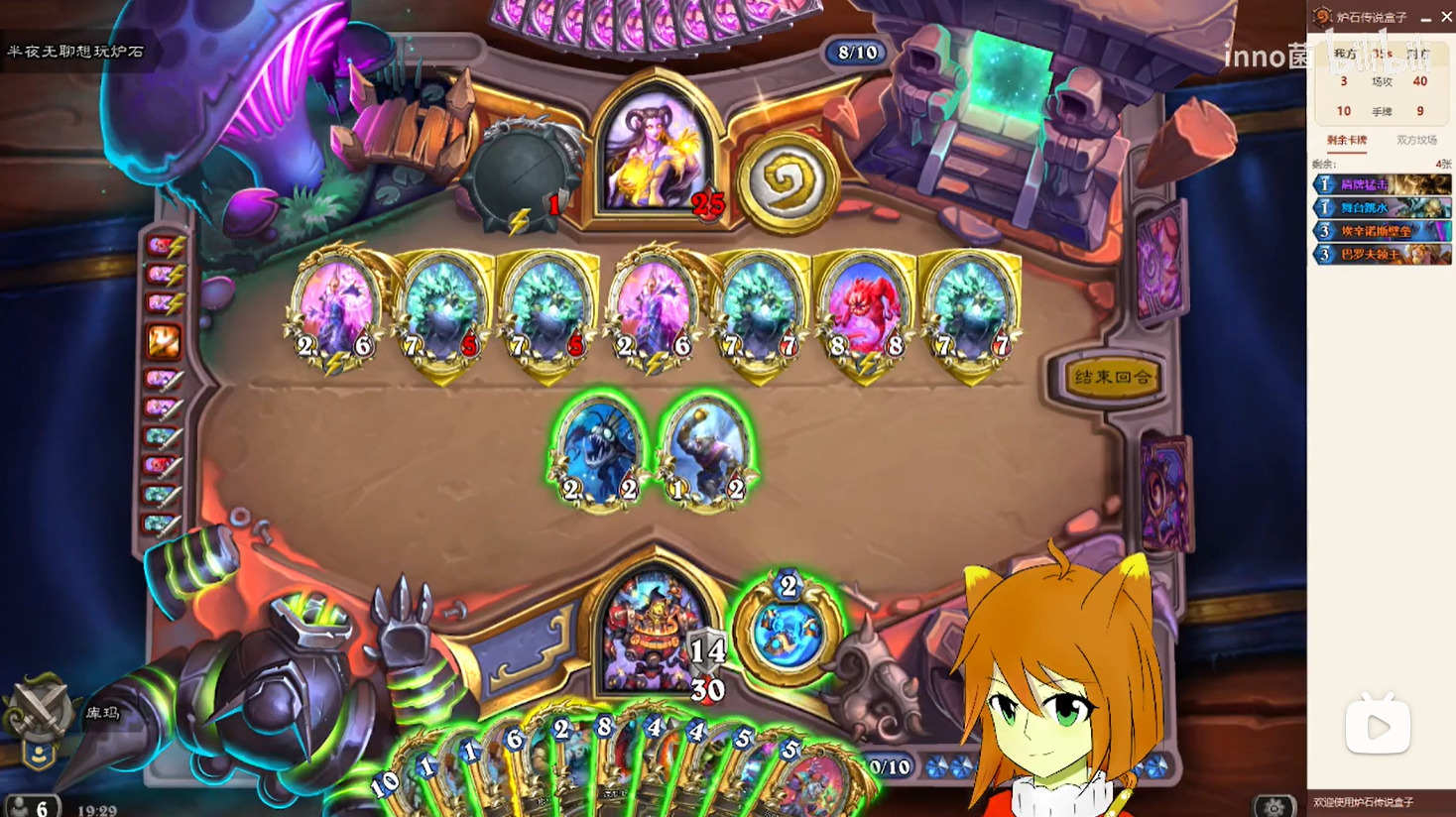 在这样的场面下对手选择了优先清场,打出了群体狂乱来解场,与此同时对手只剩下2费,最多只能用复活术了,不过对手似乎并没有抽到,仅仅是奶了一口脸就回合结束了;如果对手此时使用手里更高费用的解牌(不管是带的,还是发现的),对手甚至连复活术的2费都挤不出来,就结果而言,再一次延缓了对手铺怪的节奏,又成功拖了一个回合;