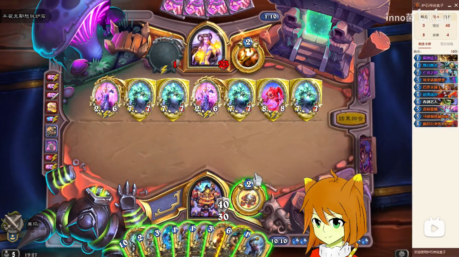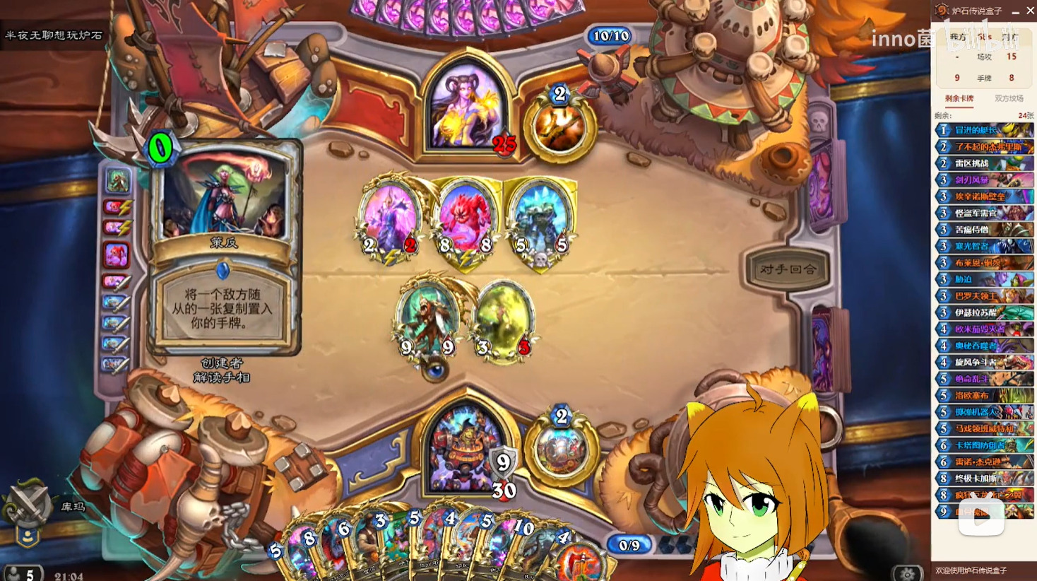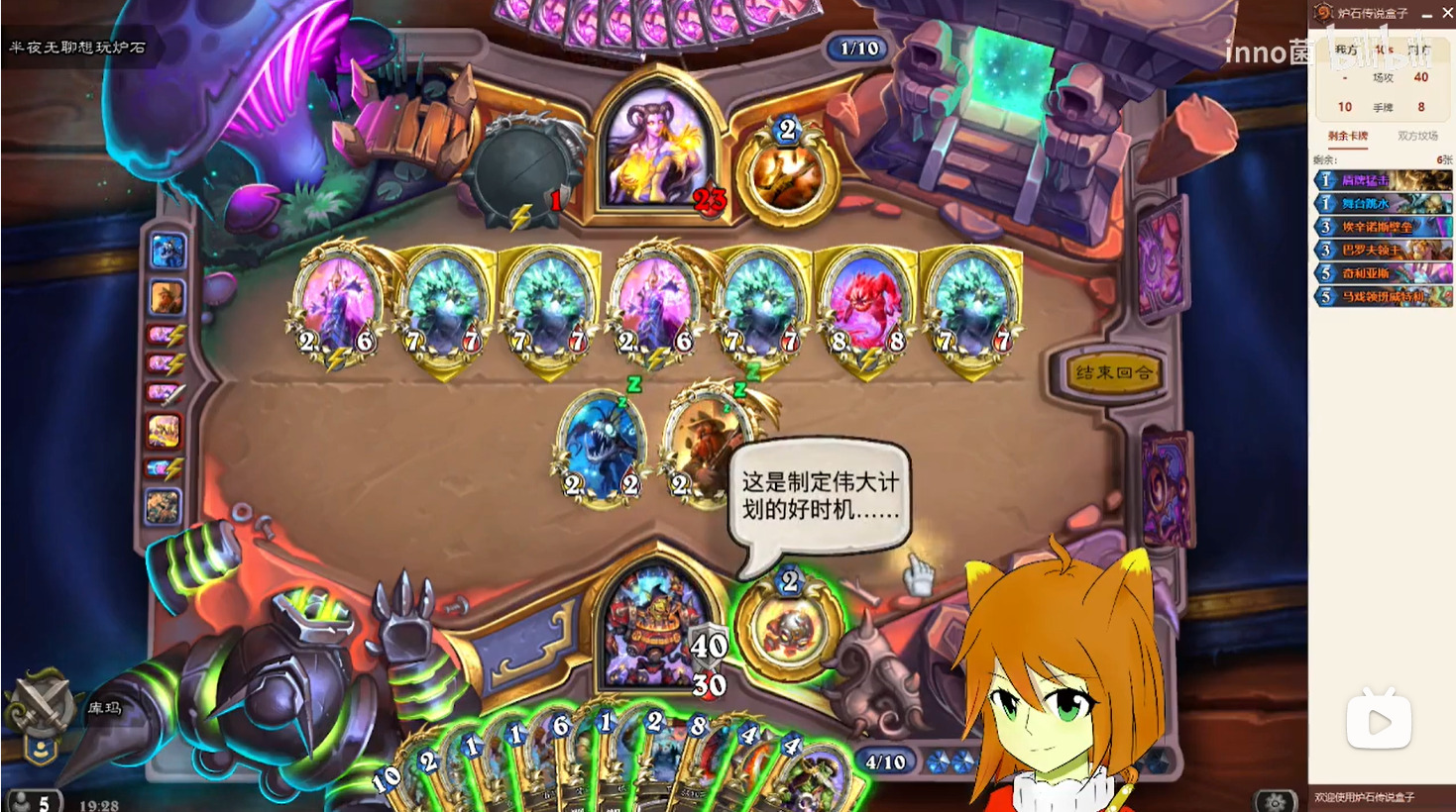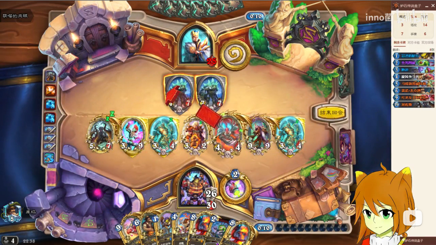 在这样的场面下对手选择了优先清场,打出了群体狂乱来解场,与此同时对手只剩下2费,最多只能用复活术了,不过对手似乎并没有抽到,仅仅是奶了一口脸就回合结束了;如果对手此时使用手里更高费用的解牌(不管是带的,还是发现的),对手甚至连复活术的2费都挤不出来,就结果而言,再一次延缓了对手铺怪的节奏,又成功拖了一个回合;
