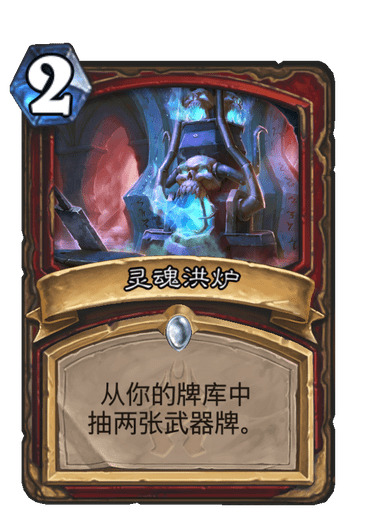 随着前锋战斧这把优质新武器的加入,战士再获得一种武器过牌手段。灵魂洪炉配合三刀的过牌体系便更加具有实战意义。这里三把刀选择为海盗锚、前锋战斧、埃辛诺斯壁垒(蛋盾)。灵魂洪炉从三把刀中检索两把刀,能稳定抽到一把具有过牌能力的刀。节奏上,2费烘炉接3费海盗锚能够更早地检索牌库中的海盗,在该体系中一般携带一张艇长和一张黏指狗头人来作为检索对象。在这之后通过前锋战斧继续解场过牌。