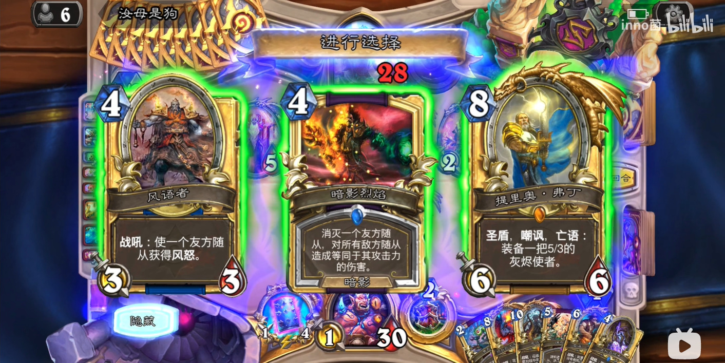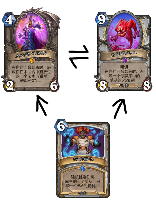 最终我选择了:肉肉解怪→战斗怒火(2费)→亡者之牌(2费)→姐夫(2费,锁4费)→暗影烈焰。完成了解场、站场、肉肉送墓、压缩牌库和资源续航。
