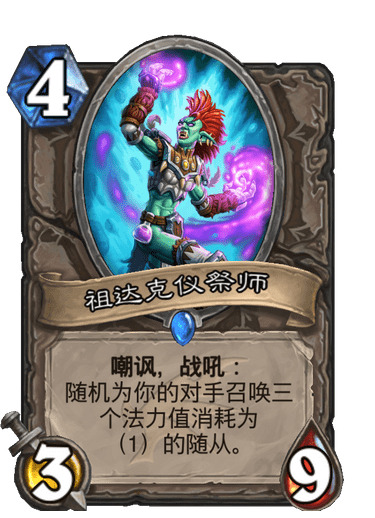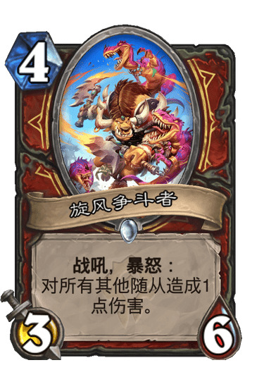 这里特别说一下新卡旋风争斗者,其本身特效和身材就足够超模,暴怒的特效既能打出一些组合技,也能干扰对手的节奏,成为战士职业中又一张全场打1的代表卡片。与之相类似的暴虐食尸鬼虽然没有暴怒的特效,但其3费的费用使其与旋风争斗者区别开来,在面对快攻铺场时,这1费时常会对节奏有重大影响。