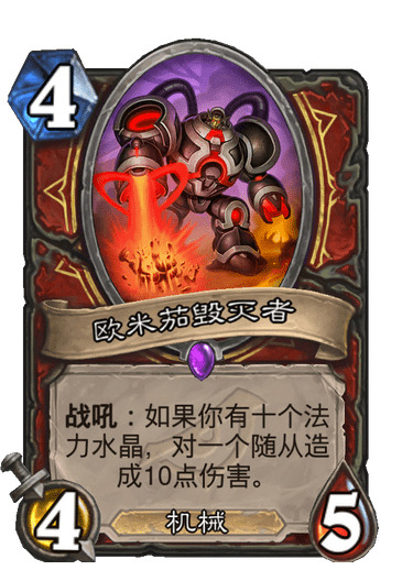 相较于废铁魔像配合奇利亚斯,欧米茄毁灭者的优点在于主动,主动的战吼特效,可以隔墙解怪。和奇利亚斯贴贴后77身材的圣盾嘲讽吸血突袭可以刚好换掉废料场巨像。如果血量危及,亦可以放弃特效9费直接出(对战快攻时4费毁灭者5费贴奇利亚斯也能给大多数快攻当头一棒,毁灭者非嘲讽的特性反而成了该组合技的一层隐形保护伞)。废铁魔像的优势在于其亡语属性,能被恩佐斯复活,然而在面对大哥牧时,其与卡塔图有着相同的优缺点。