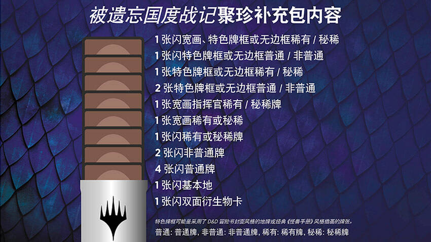 - 10张普通牌(在 33% 的被遗忘国度战记补充包里,一张任意稀有度的传统闪卡会取代普通牌的位置)