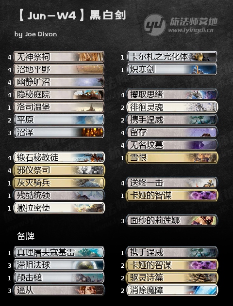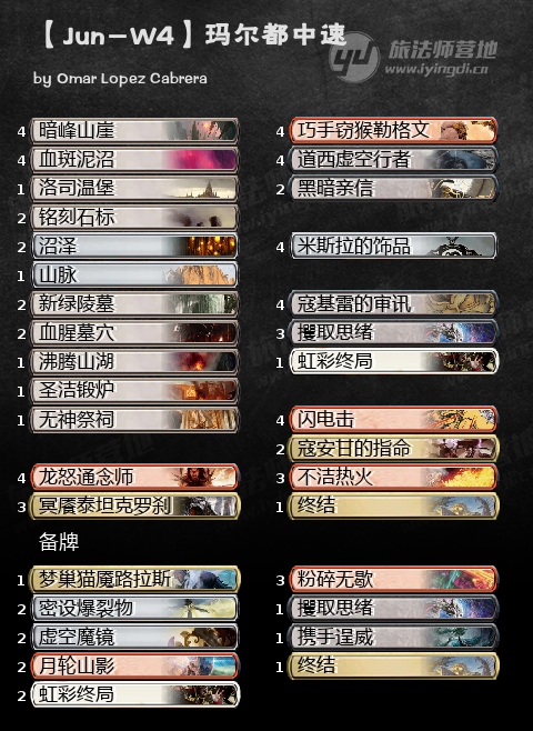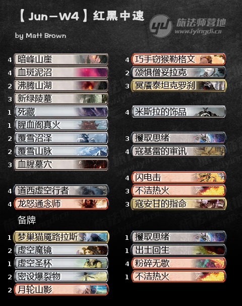 现金赛的冠军是玛尔都中速,也是本周重点介绍的卡组,掺白的版本与红黑中速差不多,这里我都贴出来,统称为“红黑系中速”。红黑系中速是本周出现数量最多的套牌,大体构造有点像之前的红黑阴影,只不过把大小阴影换成了巧手窃猴勒格文和龙怒通念师,再带了4张道西虚空行者,因此套牌整体的基调更像是偏向手牌破坏的红蓝咒语。但相比红蓝色组,红黑色组则有更好的抗性,丰富的烧杀手段能够帮助套牌在前期资源交换的时候更占优势;当然,红黑的缺点也很明显,整套牌更偏向于一锤子买卖,调整能力很差,很容易变成牌库顶游戏,凑躁狂的速度也要比蓝色慢不少,而且我个人感觉这套牌似乎没有掺白的必要,白色并不能帮助你调整手牌,所以我个人感觉这套红黑中速之后有可能会向格利极色的方向发展。