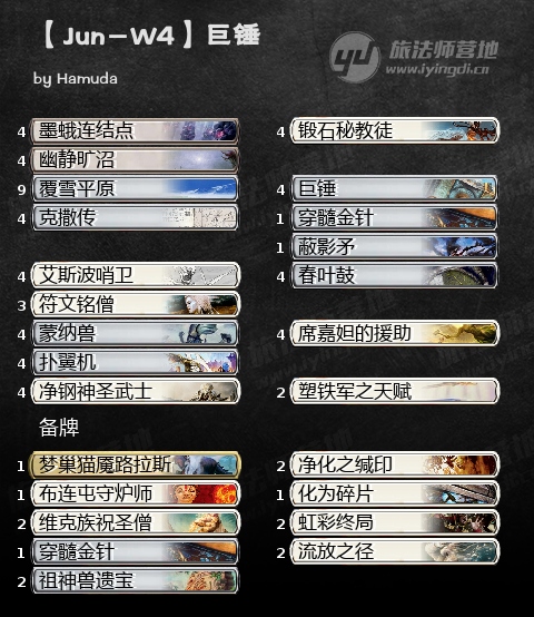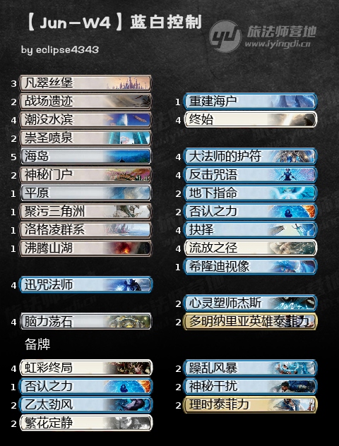 这套牌算是传统控制荣光了,虽然连前16都没到。这牌主牌带满了脑力荡石和终始,企图还原薪传蓝白控制的感觉,虽然节奏上慢了不少,但至少是一个解决终始上手的好方案。不过在我看来,我更偏向于环境初期的蓝白控方案,即带克撒传、1到2张探险地图的版本。只不过不论什么方案,在面对现在的主流中速或者快攻套牌时,蓝白控是在有些捉襟见肘,只建议信仰玩家使用。