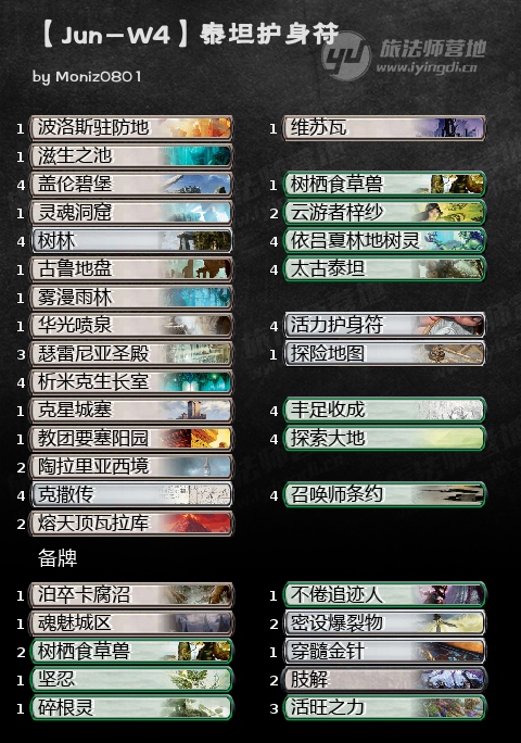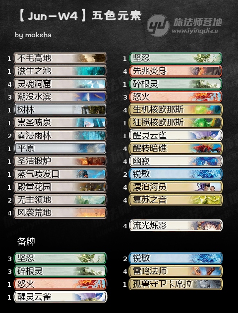 金鱼上这套牌的名字是Five-Colors Elemental,我看了好久,都没参透这雷鸣法师的黑为啥还给算了一色,不过所有颜色都有了五色姑且就五色把,听着霸气。MH2的五色呼魂秘稀都是元素,当然直接搞活了元素思路,这套元素也是获得了本周挑战赛 的8 强。套牌把除了黑色的其他四位呼魂人都请了进来,配合上流光烁影很容易赚到节奏。看配地,这套牌对找地的要求应该是很高的,小伙伴们一定得多多练习才能良好的驾驭。