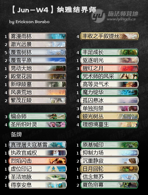 结界思路(不是说“思路”不会被点亮了么……)在MH2发布之后获得了极大的加强,不仅有了强大的结界苗地(圣所织叶灵),还有了稳定的结界导师(银光树丛),再加上代价很小的永久浓雾(单独拘禁,别担心丰收之手叙提丝会帮你解决过牌的问题),颇有一种你强任你强,我垒我的墙的感觉。由于目前环境中主流卡组都是红蓝黑色,结界套诸如孤囚悬冰、驱逐明光等点杀单卡几乎不用担心被解掉,只要能在对手抢死自己之前找到保命结界,赢下对局基本就是时间问题了(u1s1,这套牌我老喜欢了)。
