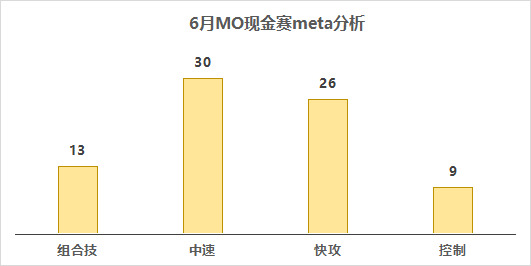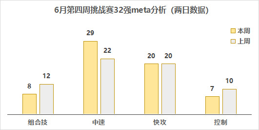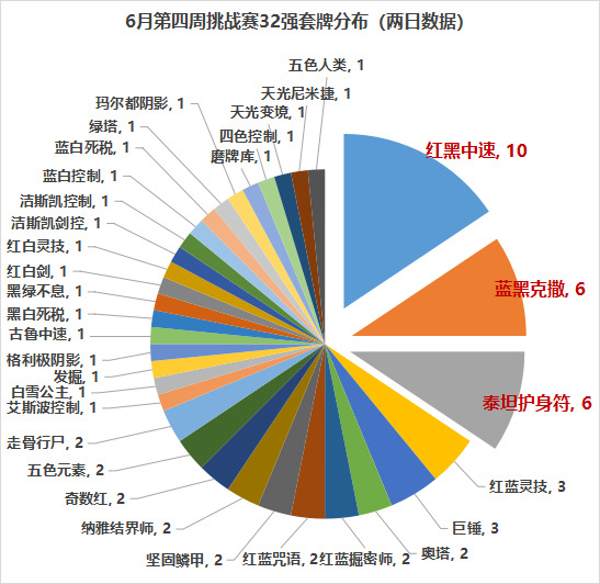 本周比赛是红黑中速的天下,套牌数量获得了第一名(10套),第二名是上周的蓝黑克撒,本周还有数量上的提升,共6套,并列第二名的是加入了克撒传体系之后的泰坦护身符(6套);条形图方面,由于红黑中速的大量涌出,本周中速套牌环比上周暴增7套,其余除了快攻之外的套牌都有相应的减少。