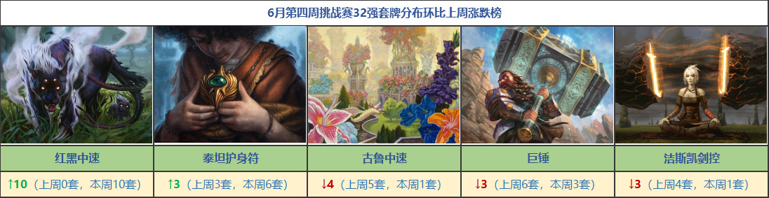 本周的单套牌涨跌情况如下图,红黑中速是新产物(上周仅有一套红黑阴影),环比上周相当于增加了10,泰坦护身符也有3套的增长幅度;下降方面,古鲁中速可能真的是骗局,本周减少了4套,巨锤和洁斯凯剑控也都减少了3套: