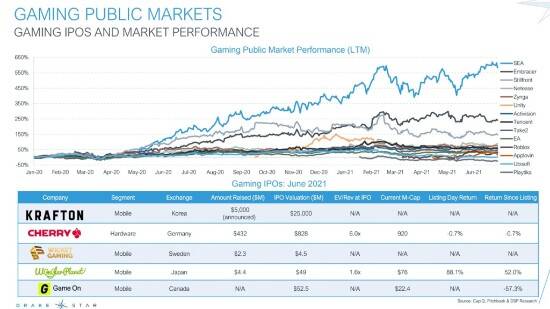 在整个游戏市场,2021年上半年有37项已经宣布和已经完成的IPO,募集资金达到了惊人的112亿美元,同时还有3项价值数十亿美元的大型SPAC(借壳上市)交易。