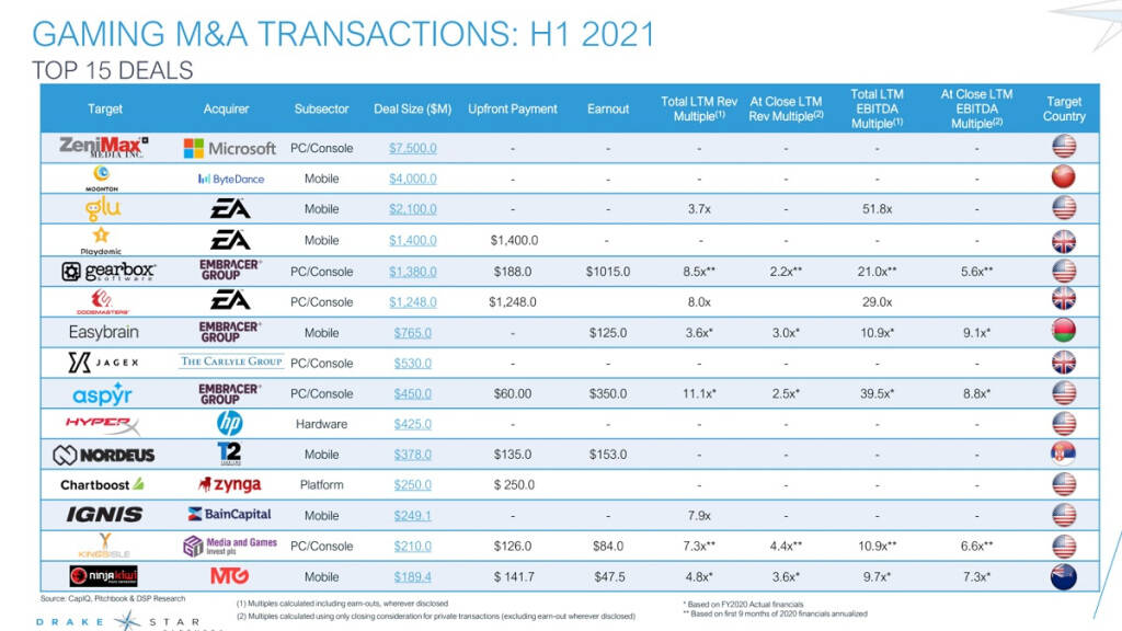 游戏行业并购在2021年H1创下历史新高 图片来源:Drake Star Partners