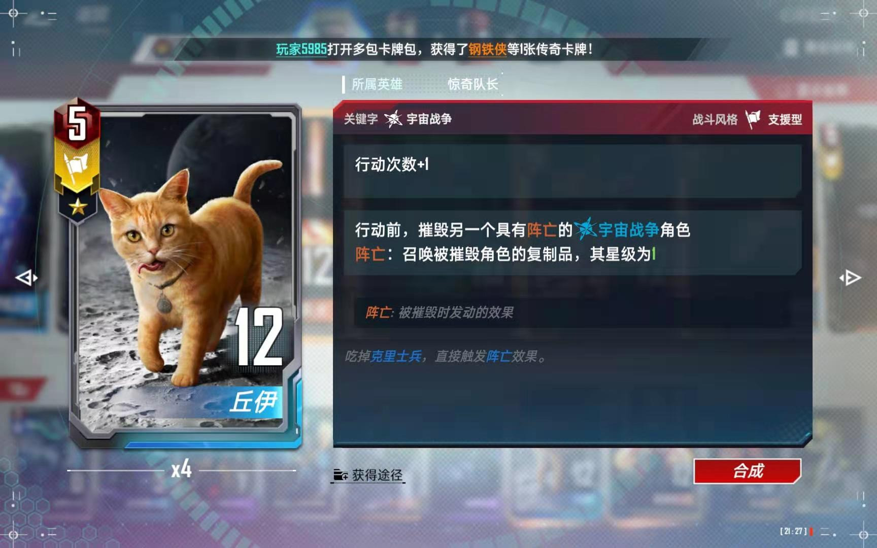 4、宇宙冲击:这个技能给猫使用,效果实在太棒了,可以多动一次,就可以多给场上两个光谱叠加一次伤害,唯一的弱点就是怕被晕,被晕了这个技能基本就没用了,所以只能作为本卡组的第四选择