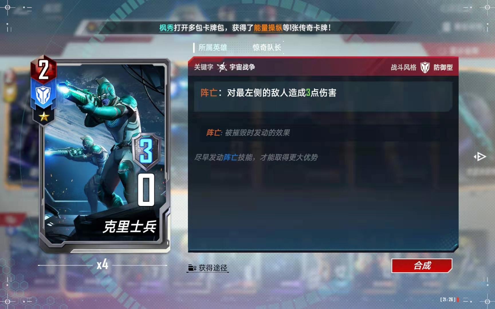 克里士兵也是只需要一张就够了,四星没有用,白浪费经济,而且第一下也是要被吃掉的。克里征兵召唤出来的士兵,也只是一星而已,带满四张这张卡没有丝毫意义。