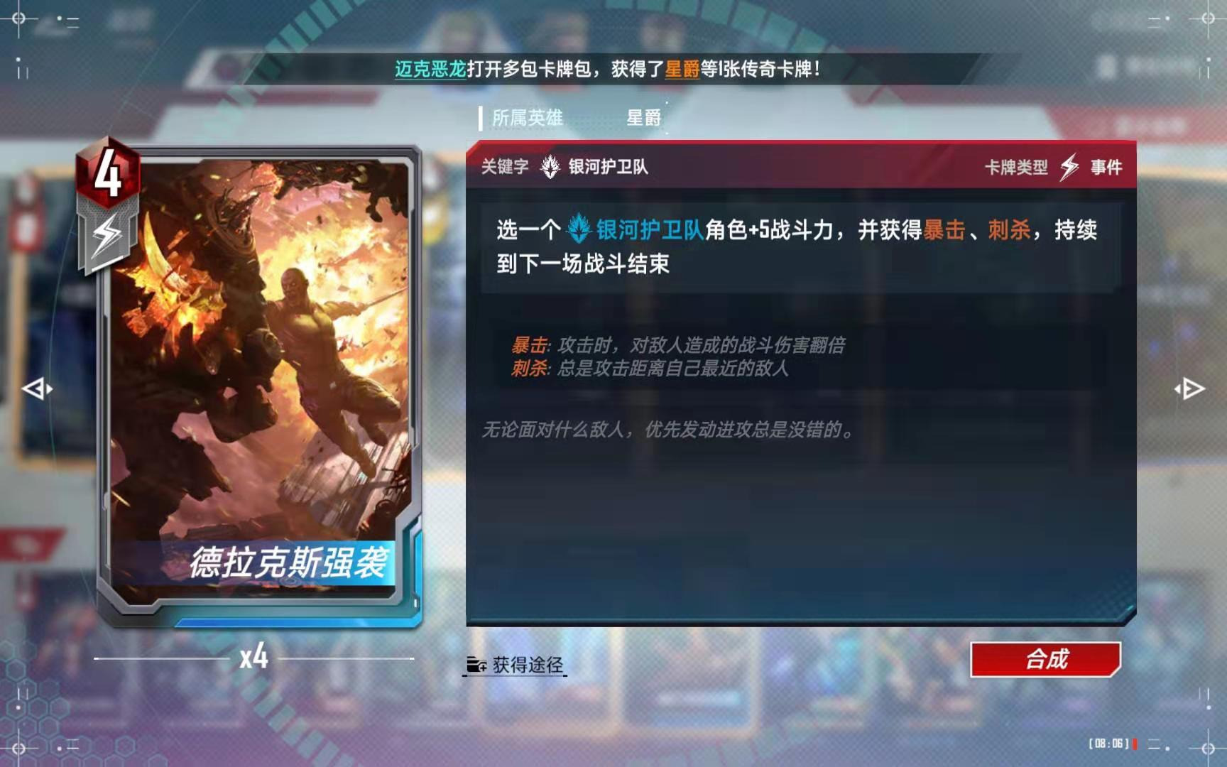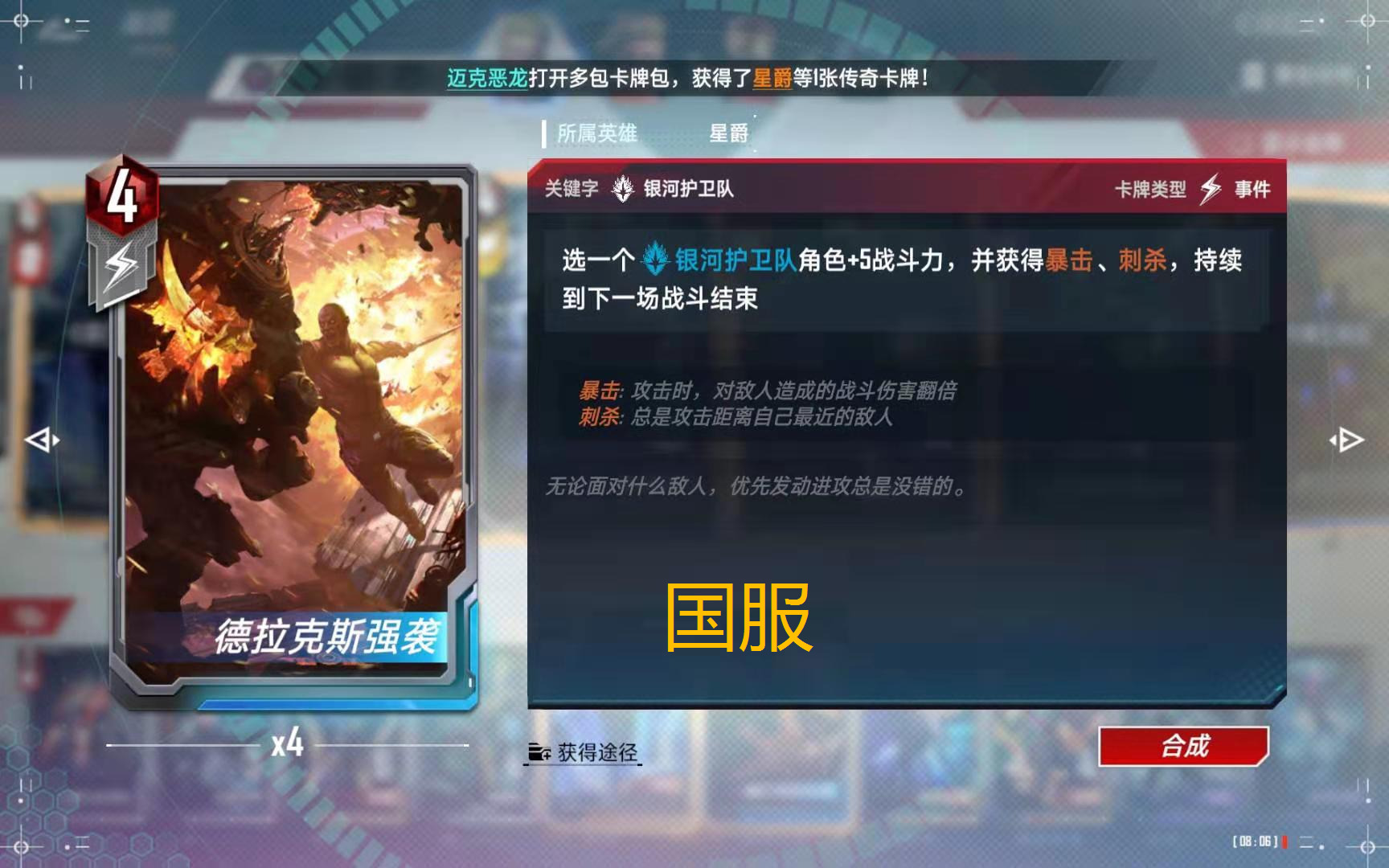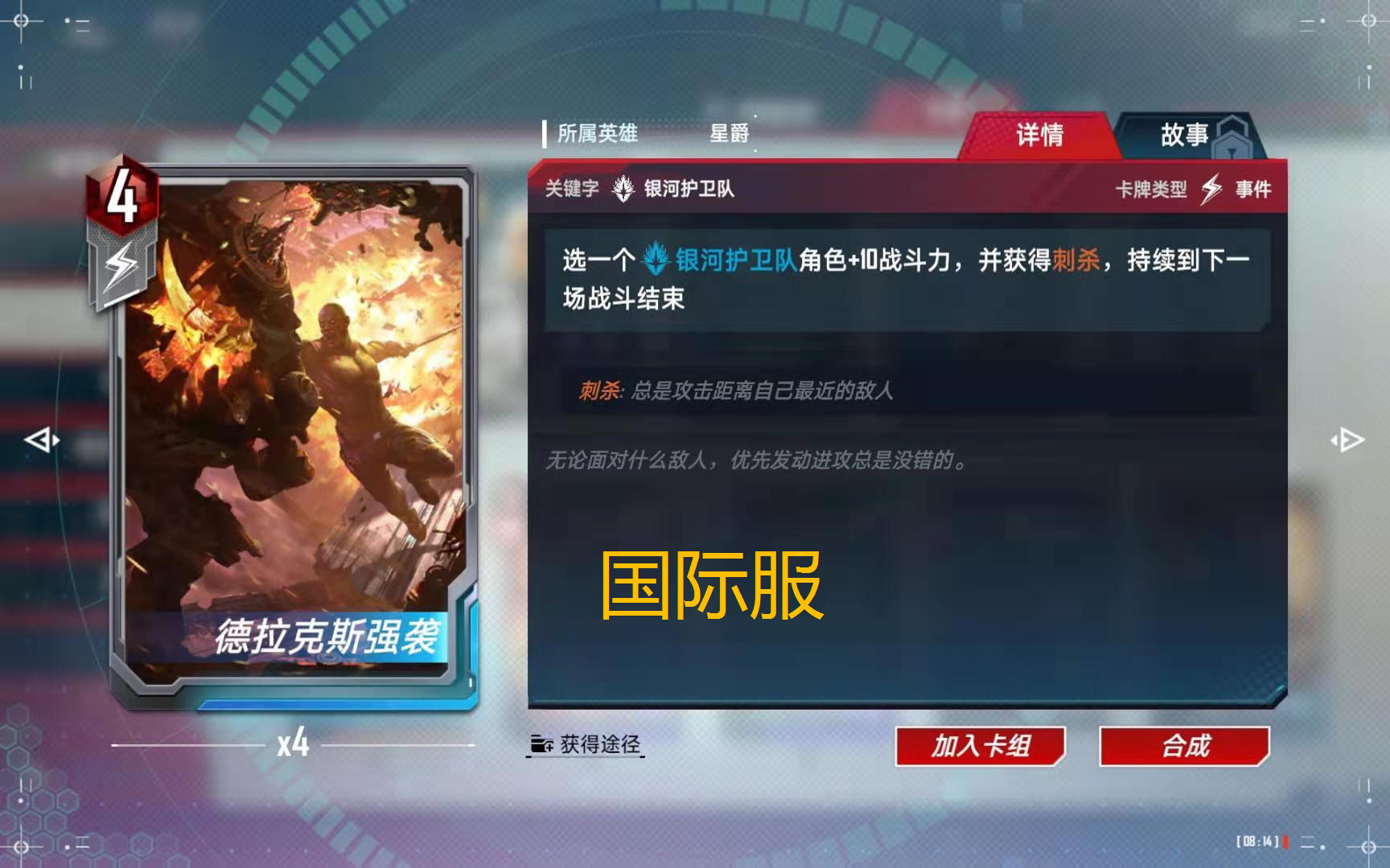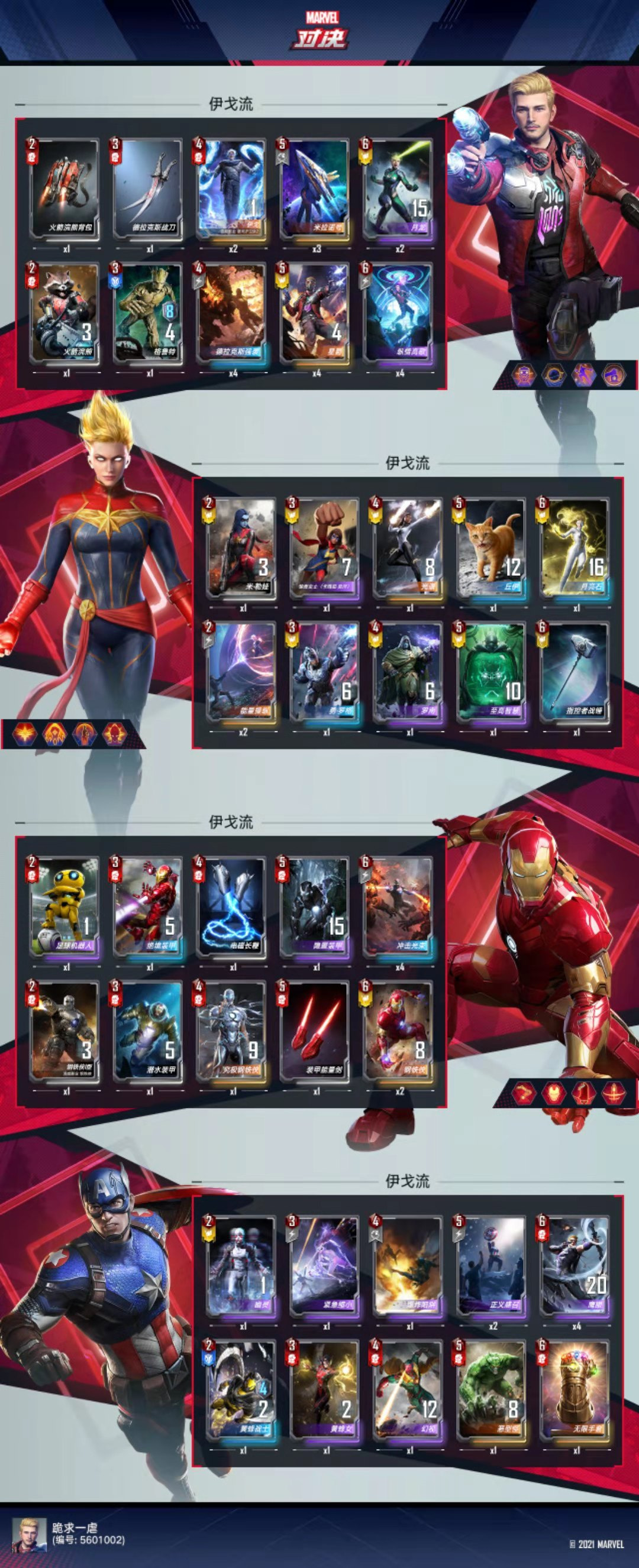 本文反国际服常规组法,用惊奇队长、星爵、钢铁侠组成了国服专属的【伊戈流】,经过我多场的测试,胜率还算不错,下来,我们就详细研究下这个卡组: