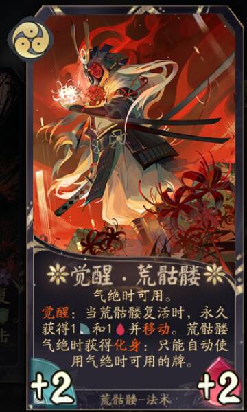 觉醒.荒骷髅:提升荒骷髅后期作战的关键,气绝后化身会让我们再次复活站场,让我们不在畏惧鬼切或者其他团灭式神的控制。