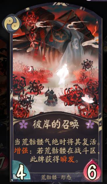 彼岸的召唤:前中期荒骷髅抗快的关键,效果的复活配合基础能力让敌方击杀荒骷髅两次才能攻击到我们,而且形态的身材提升我们3勾花海突刺的伤害,是一张进攻防守都不错的牌。