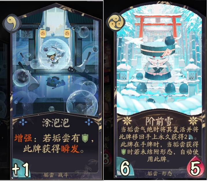 涂泡泡和阶前雪:我们因为都只选择一张就一起说,涂泡泡作为1勾战斗牌主要增加垢尝的攻击频率,而增强效果的瞬发因为我们没有其他手段获得护甲,所以使用方法就是垢尝A获得护甲在瞬发使用。而阶前雪作为后期不断能复活垢尝保持我们作战能力的关键牌,选择一张还是不错。