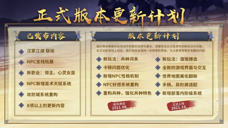 官方表示《部落与弯刀》在EA测试期间进行了35次**小小的更新,各方面有了明显变化。他们会在8月推出新玩法、卡顿问题优化、NPC性格机制和好感系统重构、兵种特色强化等内容。在10月份,将推出游戏正式版。