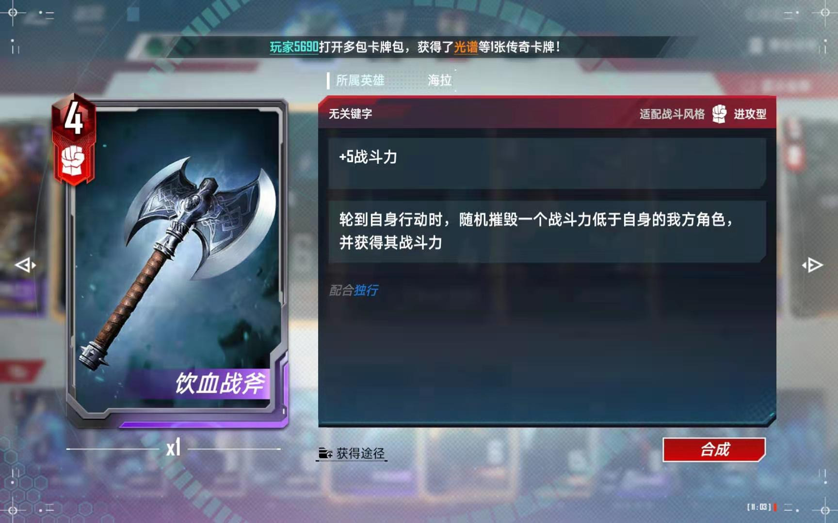 五、饮血战服,1张,这张卡是很核心的武器卡,一张就够了,给海拉或者毁灭者佩戴。