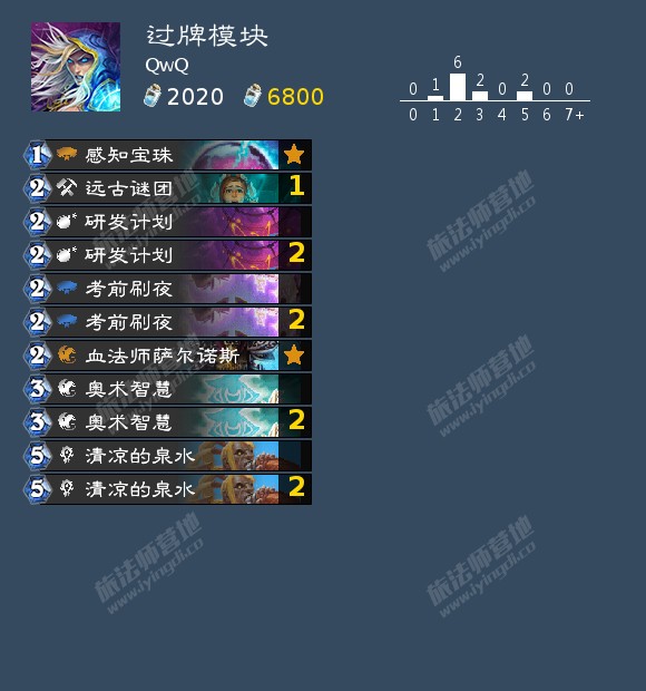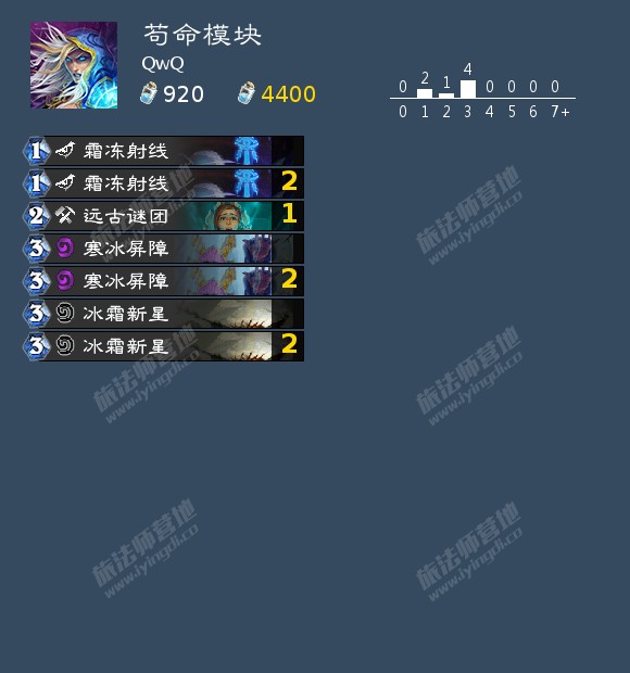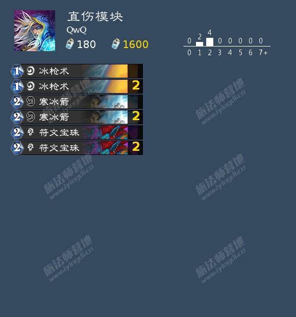 直伤模块,一般能抽到三张伤害就够了,起手一般不留,打黑眼术可以留一个寒冰箭,斩杀时最好先打符文宝珠找低费法术多刷点法强,可以用符文宝珠找伤害,但不要太过依靠,狂野法术池没那么容易发现好东西的。