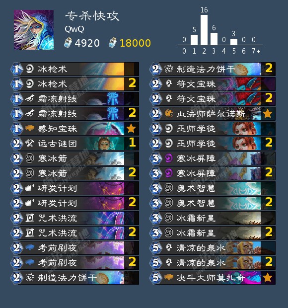 例子:海盗战1费海盗+帕奇斯+222。这种急速快攻我们基本的打不了的,但也有几次还是能胜利的,能斩杀的对局剧本大概是这样的:1-2费就打出咒术洪流,之后一边过牌一边控场,决斗大师和巫师学徒快速抽到就启动斩杀;前期没有洪流减费、没有足够的过牌抽到冰环冰箱、决斗大师沉底都会输。不过也不要开局就投,对面不一定能1费就铺起来