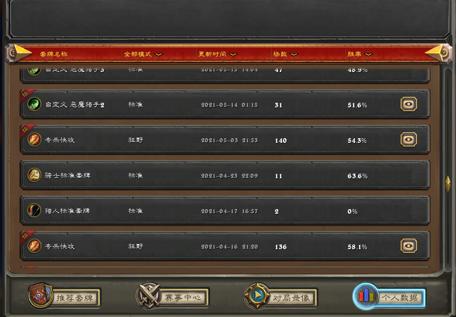 从去年8月到现在,基本上每个月我都是用决斗法上传说的(钻石以下偶尔用奇数猎等会快一些,钻石到传说3000都是决斗法,再上去就没继续打了),胜率大概在56这样。