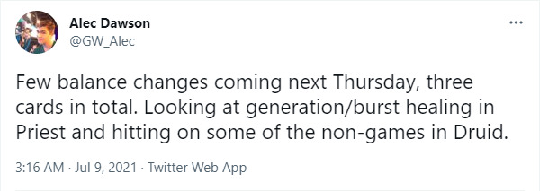 Alec没具体说削哪几张,但也已经划出了很明显的重点。“一共有三张,”他说道,“关照的是牧师的衍生和爆发性奶量,以及德鲁伊的一些系统局情况。”