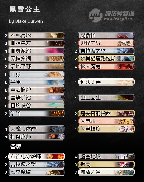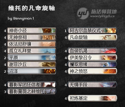 本周的开胃菜是Bennymon1带来的史迹构筑,致力于达成暮影蔷薇之棘维托+凡命旋轴的组合技。这套牌的主要计划是用电震圈、破碎空境伊美黎、阿古尔血禁仪式等单卡烫血,然后结算暮影蔷薇之棘维托和凡命旋轴。设想下这样的情况:我们把自己打到10血,此时对手的生命还是20(有一说一还是很合理的,毕竟这套牌没什么进攻手段)。在下个维持开始时,凡命旋轴触发,交换两家的血量。根据规则,我们有10变为20血,获得了10点生命,这会触发维托的异能使对手失去10点生命,恰好完成斩杀!这套牌还有祀炼基定作为组合技的备用手段,允许我们活到负血量然后用凡命旋轴直接获胜。这套牌最大的问题是凡命旋轴的费用过高,在结算后还需要等待一回合才能获胜。套牌携带的大量去除在一定程度上解决了这个问题,帮助我们控制场面直到凡命旋轴结算。总的来说,这套牌竞技性并不是很高,但它绝对可以取得一些特别的胜利!