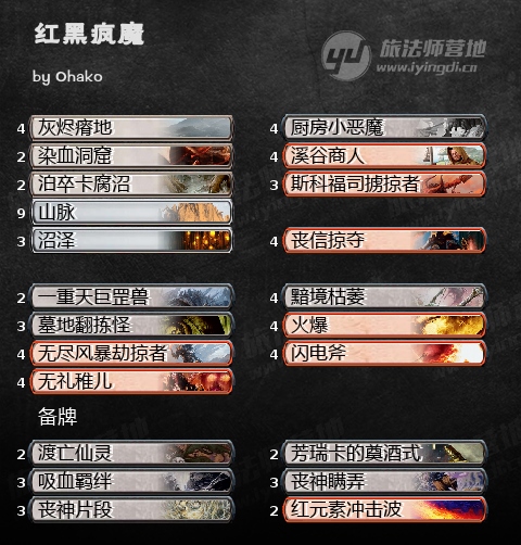 MH2已经给摩登和薪传赛制带来了巨大影响,这个系列也会在纯铁赛制掀起波澜吗?Ohako在他的构筑里加入了新系列带来的疯魔单卡,一费2/2飞行敏捷的厨房小恶魔和两费4/3的斯科福司掳掠者让套牌更具进攻性。套牌里大量的疯魔单卡让闪电斧的表现更加优秀,搭配黯境枯萎和火爆能应对绝大部分生物威胁。疯魔机制的一大优点是配合弃抓效应时能带来手牌优势,在某些情况下甚至让丧信掠夺拥有一费抓二的强度。我最近没怎么玩纯铁赛制,并不清楚这套牌在当前meta的表现如何。但总的来说,这个构筑足够廉价且有趣,有条件的话值得一试!