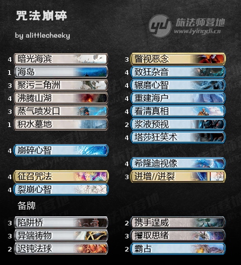 Alittlecheeky将征召咒法和磨牌库思路结合在一起,组出了这样一套牌。我们的游戏计划是在三回合结算崩碎心智,然后在下个回合施放征召咒法,翻出裂崩心智、瞥视恶念和辗磨心智中的任意两张。崩碎心智能让我们的磨牌效应翻倍,运气好的话可以直接磨空对手牌库,在下个回合获胜!塔莎狂笑术也算是对磨牌思路的补强,但要注意它是直接放逐对手的牌库顶牌,并不会触发崩碎心智。缺乏互动手段让这套牌难以应对快攻或滥康套牌,但手气好的时候我们还是有机会在第四回合获胜。