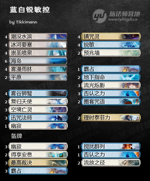 目前看来,五个呼魂元素绝对是MH2最令人激动的循环,它们也已经在竞技赛事中展现出了惊人的强度。Tikkimann尝试让锐敏变得更强,并找到了一张与其配合的单卡:雾谷狮鹫!我们的主要游戏计划是放逐雾谷狮鹫来施放锐敏、否认之力和霸占这些强力单卡,然后从放逐区施放雾谷狮鹫。套牌剩下的部分是蓝白云移/控制体系,致力于用镇咒灵和空境亡灵减缓对手的展开速度,直到我们用雾谷狮鹫等飞行生物取胜。套牌主要的缺点是雾谷狮鹫本身并不强,在主牌加入更多的幽寂/流放之径或许能让它有更好的表现。