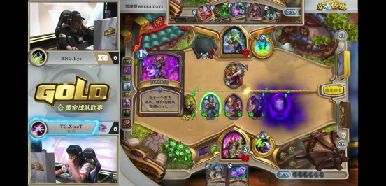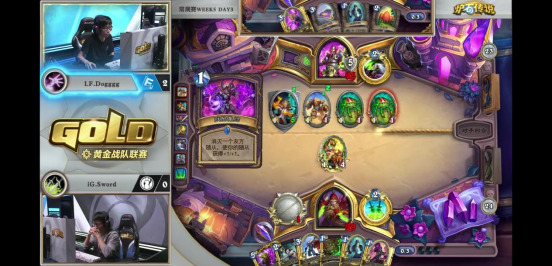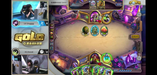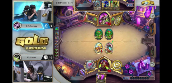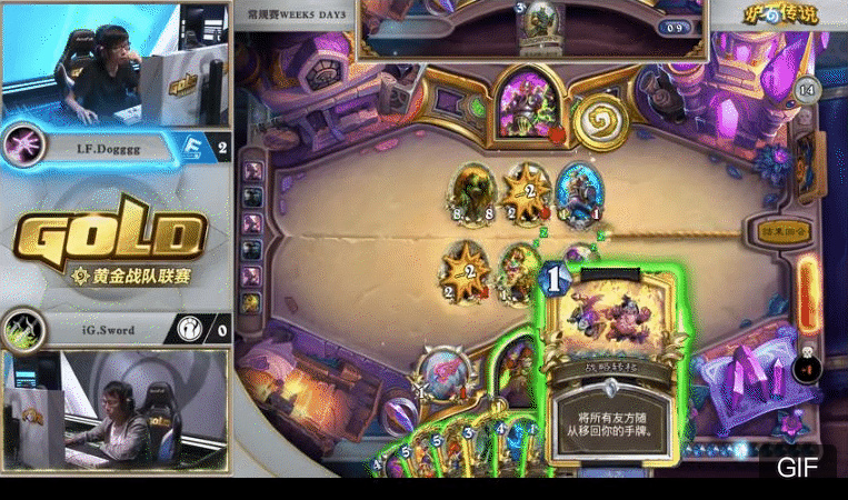 本场是LF.Dogggg的动物园对阵IG.Sword的节奏贼。四狗节奏前期爆炸,硬币出甲虫卵,下回合出怪盗天才。太极剑挂刀空过,下回合可以背刺+恶霸再加刀可以处理得七七八八,面对两个11还能反站一个14。四狗选择铺一个1/3贴个嘲讽再残酷集结,花了大力气解掉了恶霸,这样可以防住暗影步回手恶霸或者其他跟班利用恶霸当跳板的空间。清楚对手牌表没有刀扇的四狗选择了将嘲讽+2血贴给了最大的1/3,这样能在攻防上取得更大的优势。