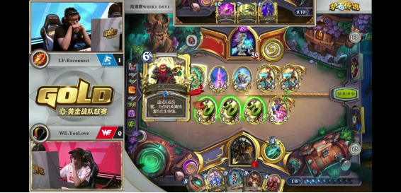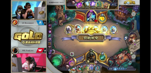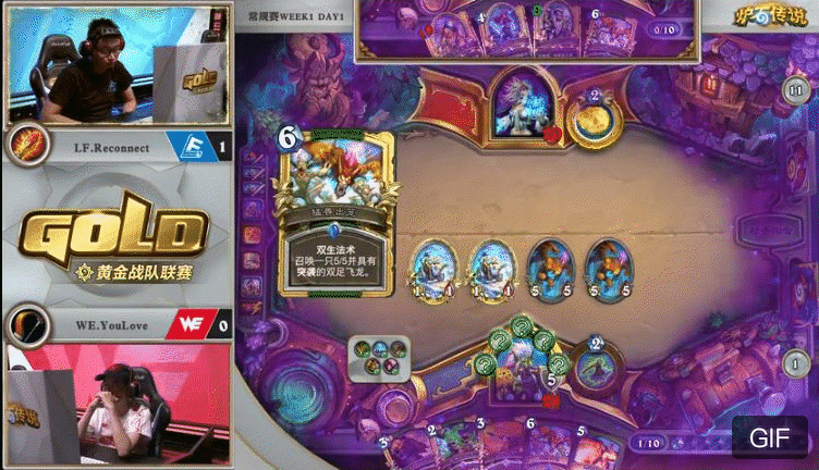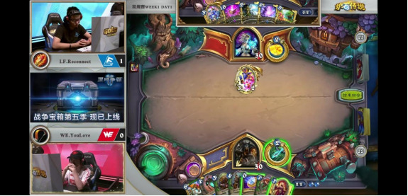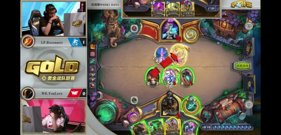 开幕战便是上届决赛双方的交手,这场对决是来自WE.YouLove的宇宙猎对阵LF.Reconnect的宇宙法。开局雨天牛展开顺利,作为更偏控制的一方,2费姐夫找成长取得费用上的领先是相对重要的,且主动站场能给自己争取更多的回合数。爱队既不能接受出奥秘守护者被白吃也不能眼睁睁地看着对手跳费陷入被动选择了硬币机械巨熊,以图在下回合能够率先铺出场面。