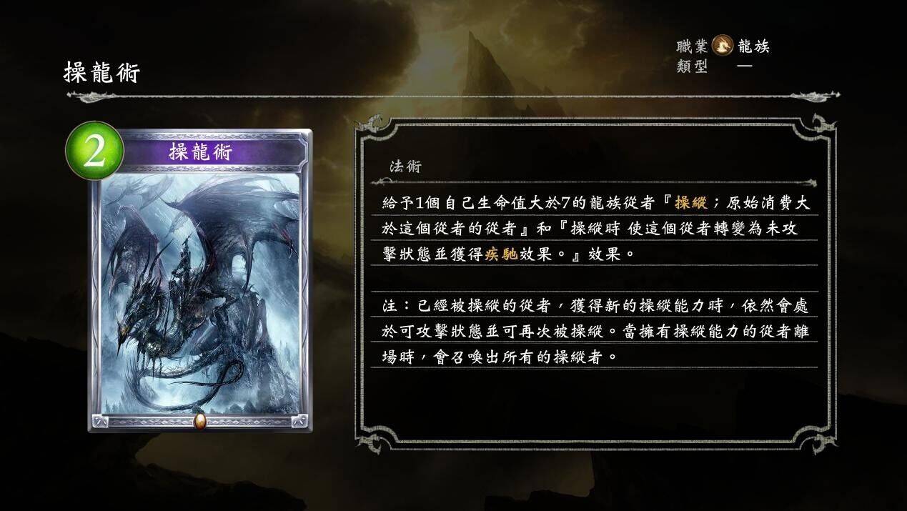 给予1个自己生命值大于7的龙族随从「操纵;原始消费大于这个随从的随从」与「操纵时 使这个随从转变为未攻击状态并获得疾驰效果」效果。