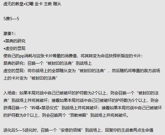 入场曲 如果本次对战中自己已被破坏的护符数为2以上,则会召唤1个被封印的法典到战场上并将其破坏。如果为5以上,则会额外召唤1个咏唱:禁忌仪式到战场上并将其破坏。如果为8以上,则会召唤2个邪教神殿到战场上并将其破坏。