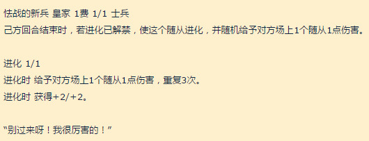 进化时 给予1个敌方随从1点伤害,这个行动进行3次。使这个随从获得+2/+2效果。