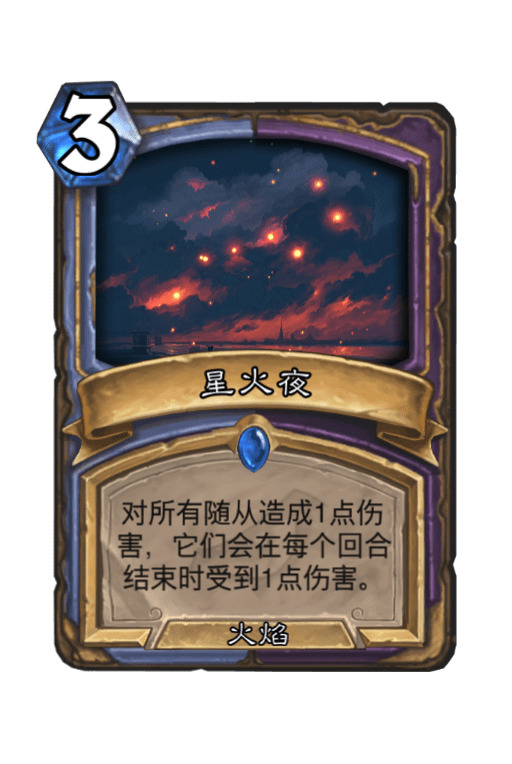 - 受到该牌伤害的随从会在每个回合结束时都受到1点伤害,有点被点燃了的感觉。