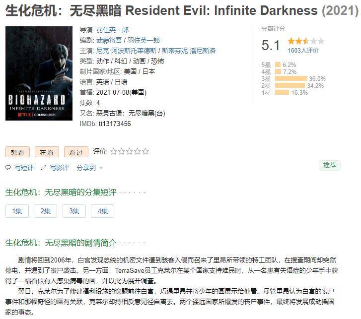 豆瓣上,《生化危机:无尽黑暗》的观众均分只有5.1分,比几年前《生化危机:复仇》的6.7分还要低。