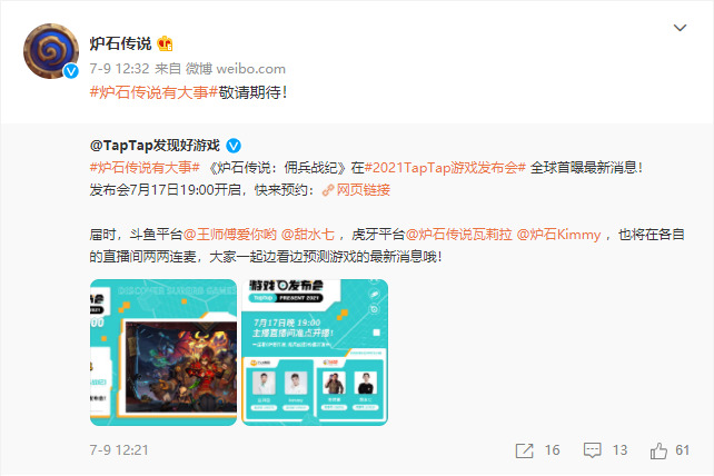 这个消息在TapTap昨天发布的发布会游戏阵容先导预告里就已出现,而今天炉石官博也转发了,看来可能是真的有大事。