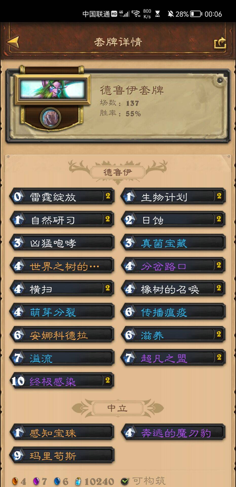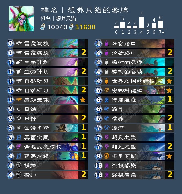 整套卡组的构成很简单,除了一张用来苟活的传播瘟疫外其他基本均为跳费+过牌体系。整套套牌仅有三张随从:奔逃的魔刃豹、安娜科德拉和玛里苟斯,这样构筑的好处在于开超凡之盟前橡树召唤可以稳定拉出豹子,超凡之盟后可以拉出两张核心随从安娜科德拉和玛里苟斯,而不会出现剑宗超凡德拉出战吼随从的尴尬局面。法术方面,整套套牌共25张法术,其中有16张为自然法术。同时,这16张自然法术大多为过牌和跳费法术,这样构筑的好处是在开超凡之盟后,安娜科德拉能对大部分法术进行减费,启动时更加流畅。以上均为对卡组构成的基本介绍,接下来我将以问答的形式为大家介绍一下卡牌的取舍和打法细节。
